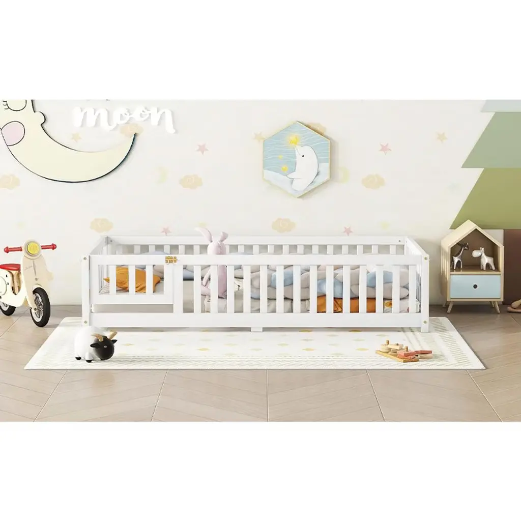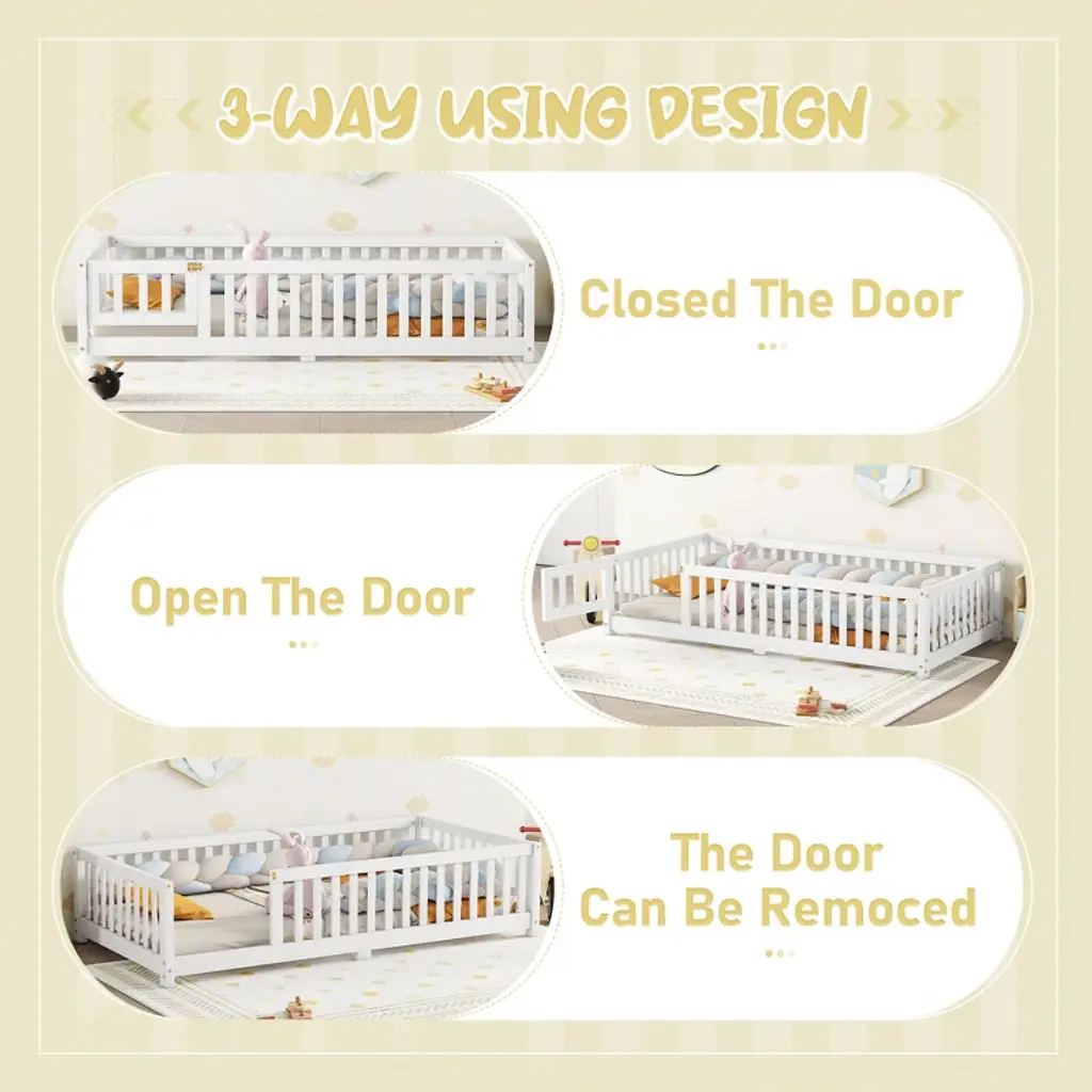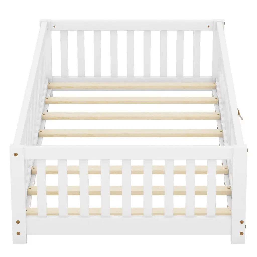 Bellemave Twin Montessori Floor Bed With Slats, Fence & Door, Low Twin Bed Frame With Center Support Bar, Easy Assembly, White