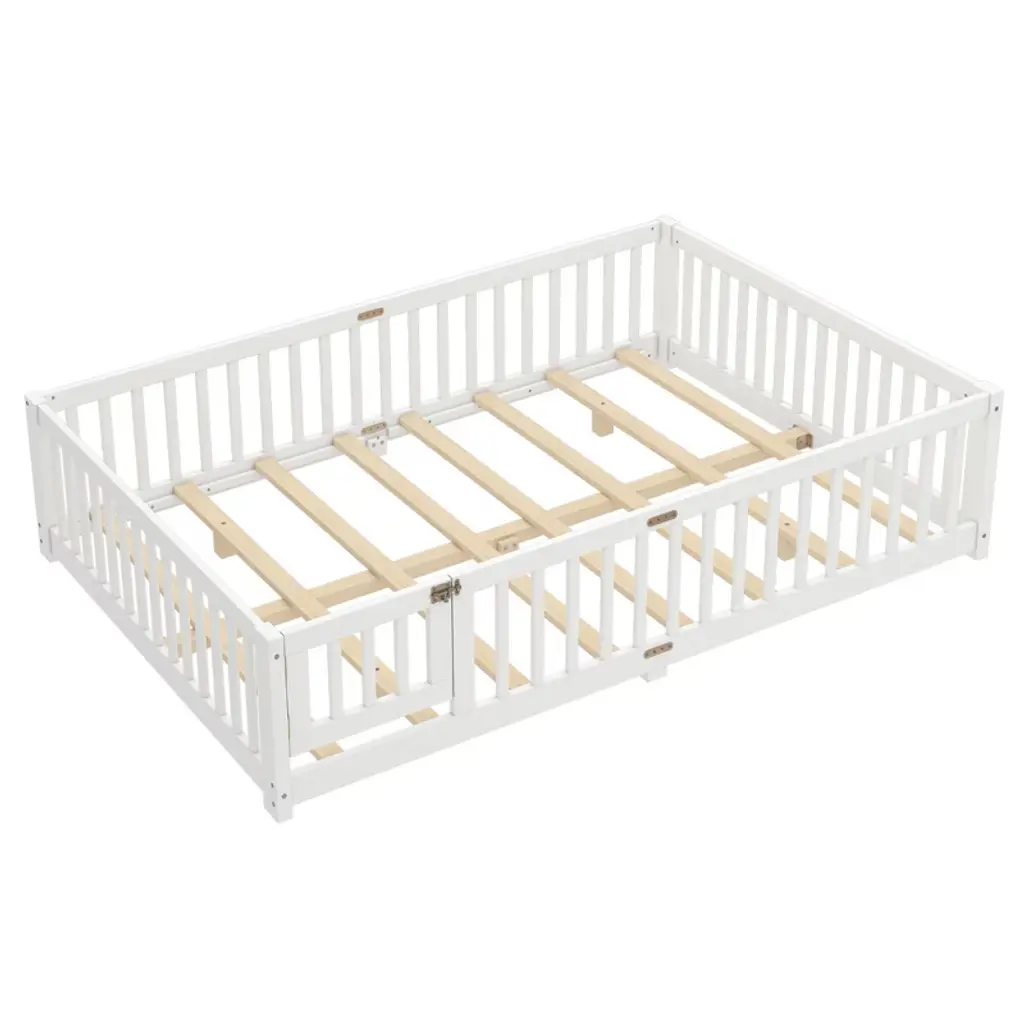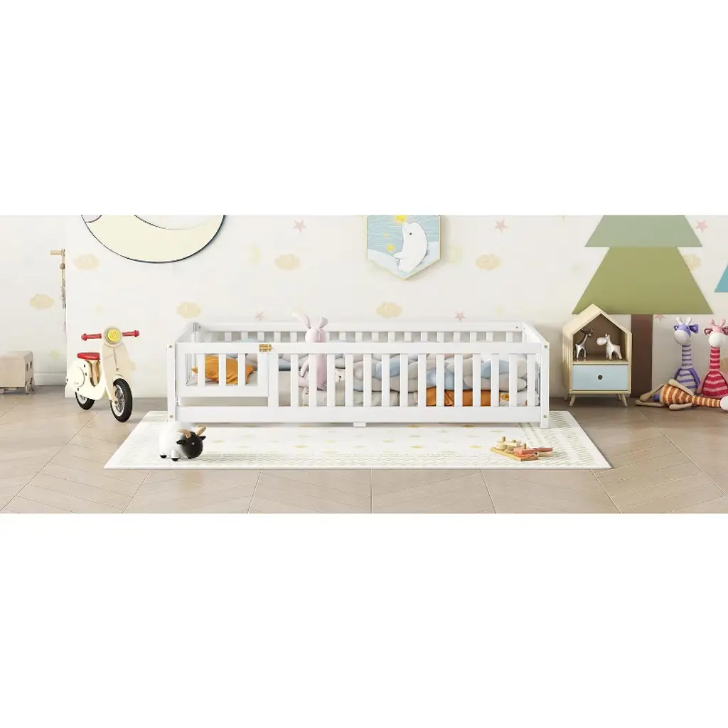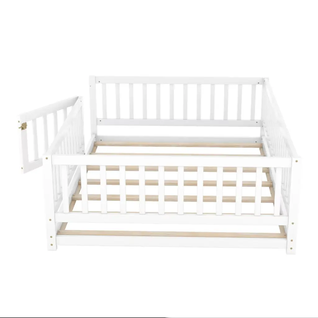 Bellemave Twin Montessori Floor Bed With Slats, Fence & Door, Low Twin Bed Frame With Center Support Bar, Easy Assembly, White