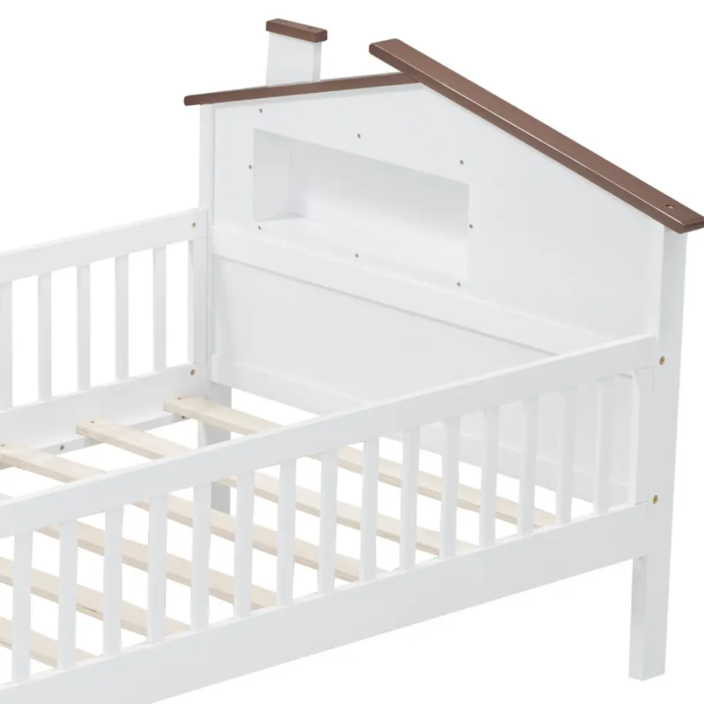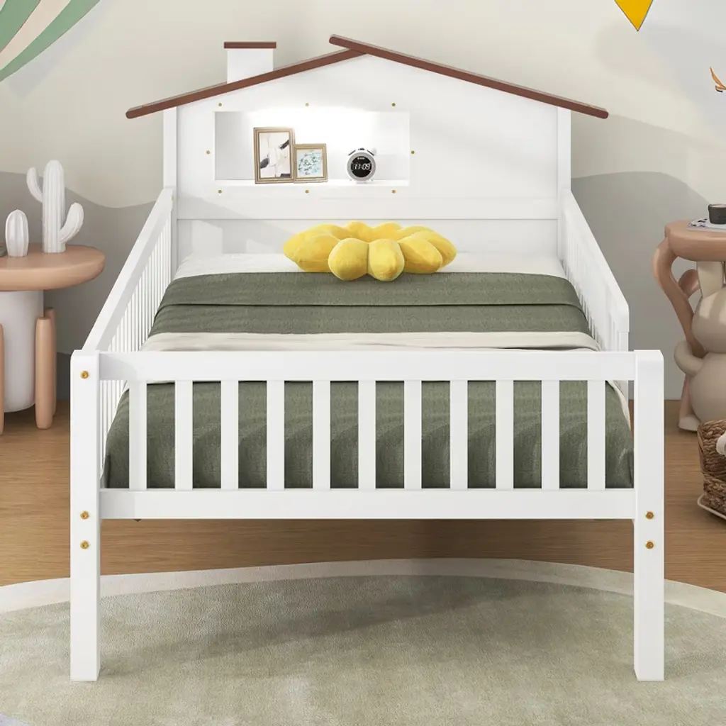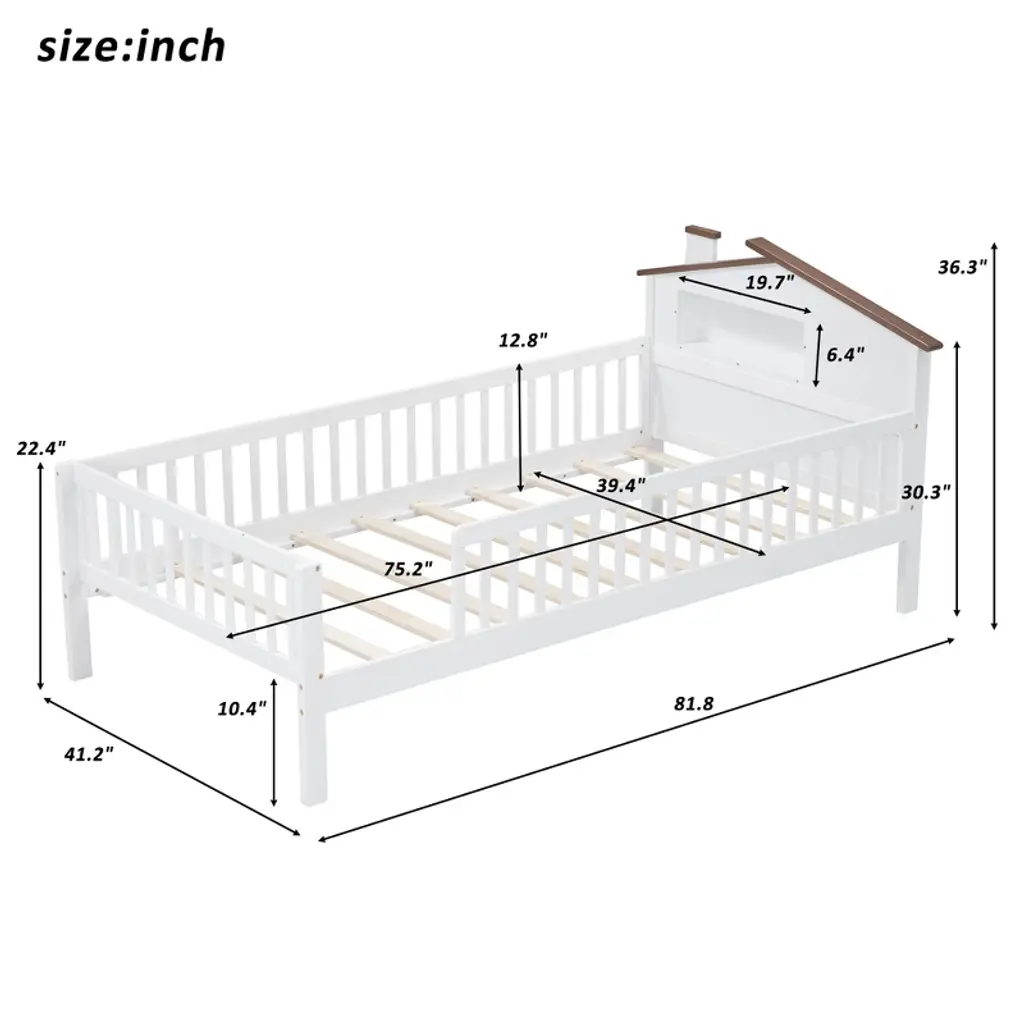 Bellemave Twin Size Montessori Bed For Kids, Twin Size Kids Bed With Fence And House-shaped Headboard And Built-in Storage, White