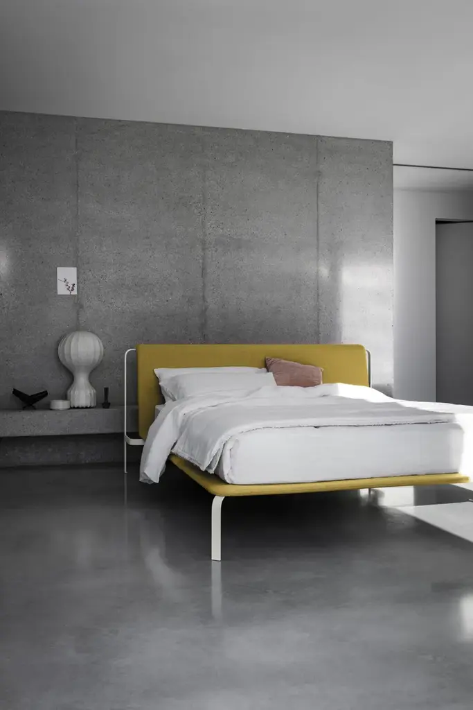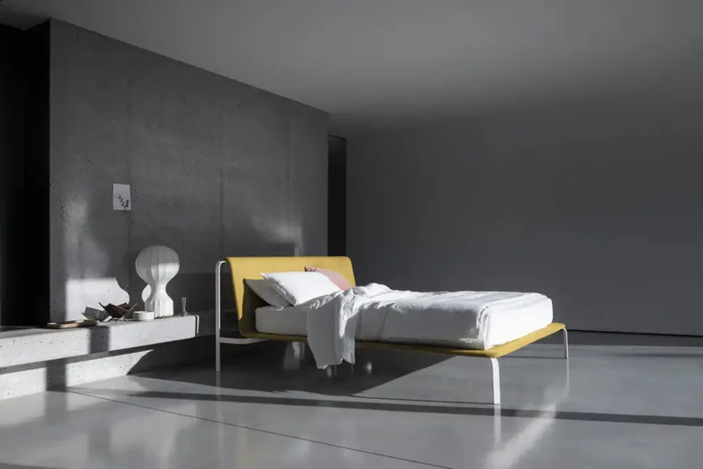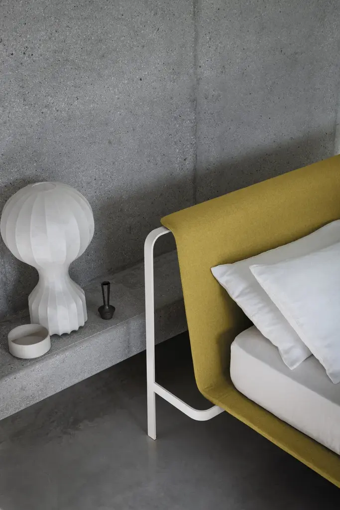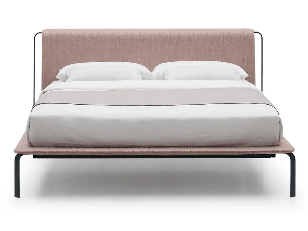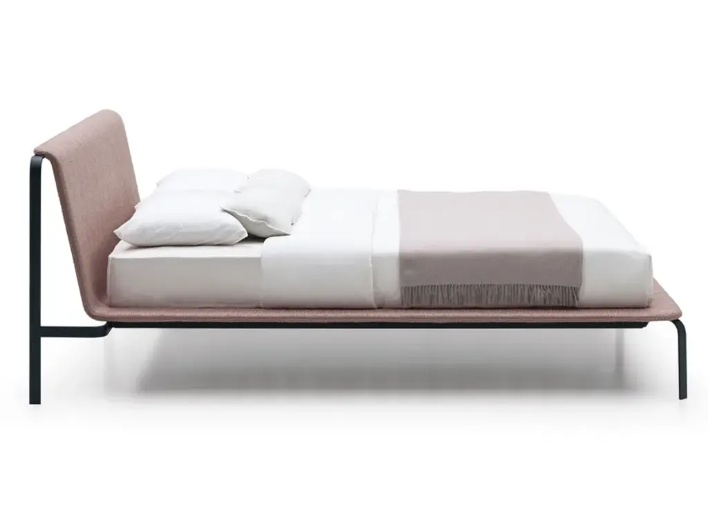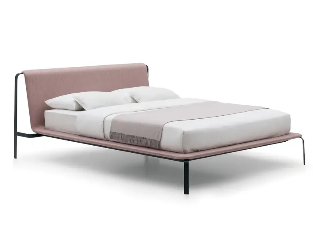 Minimalist without renouncing to the comfort, Bend bed is composed by a thin structure supporting a curved plan. The light padding, covered with fabric, creates a light and pleasant feeling. Cover is proposed in various tonalities in order to harmonize with every taste and atmosphere. Iron bed available in the finishes: matt ral lacquer 5008 gray blue, 8019 gray brown, 3005 red wine, 7044 silk gray, 6020 chrome oxide green, 9010 pure white and 9011 graphite black.Not available in leather and eco-leather.Completely removable cover.Standard stitching with closed riveting. Open stiches on request.Including base with supporting orthopedic wooden slats.