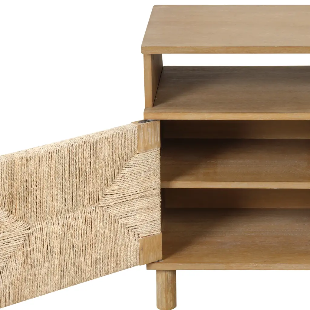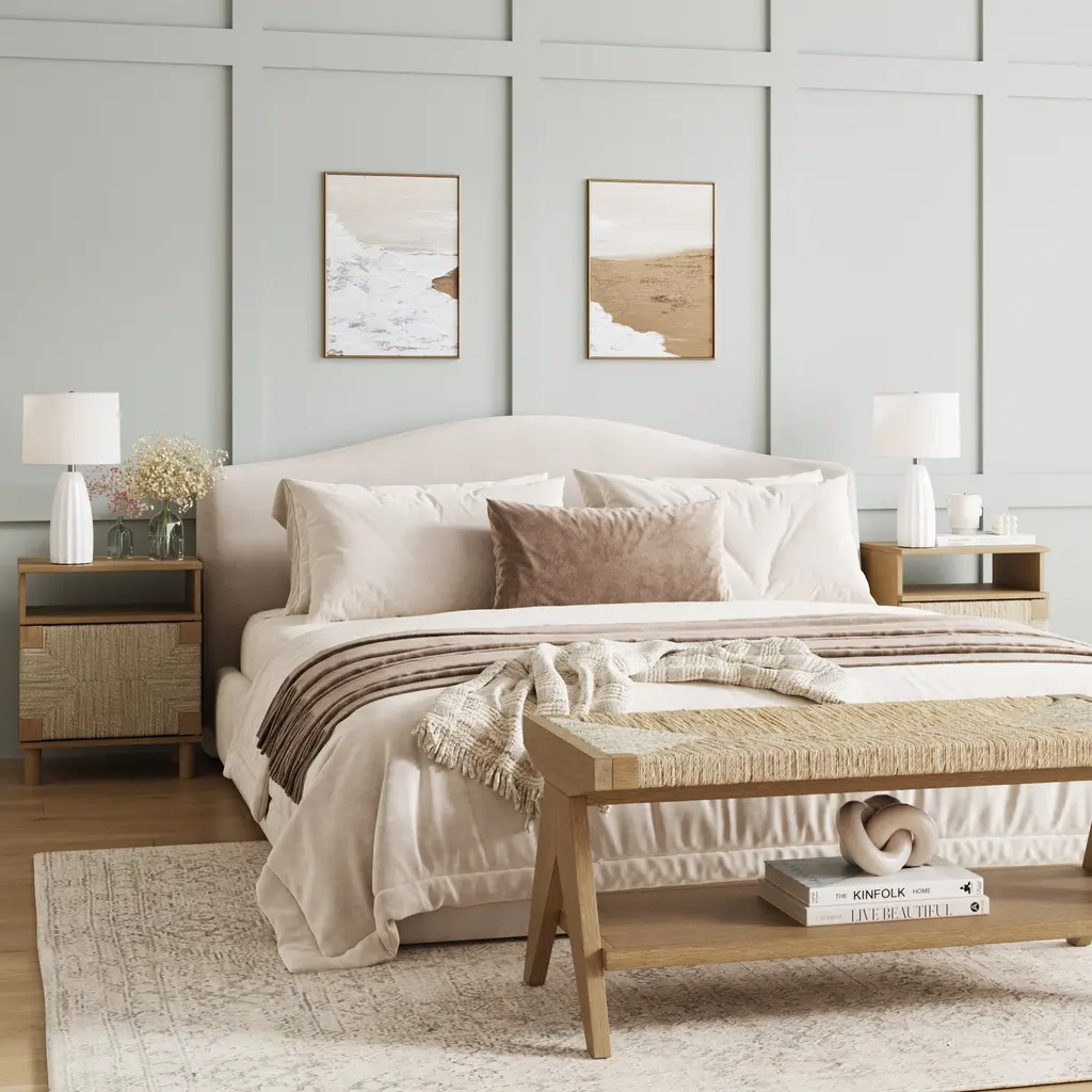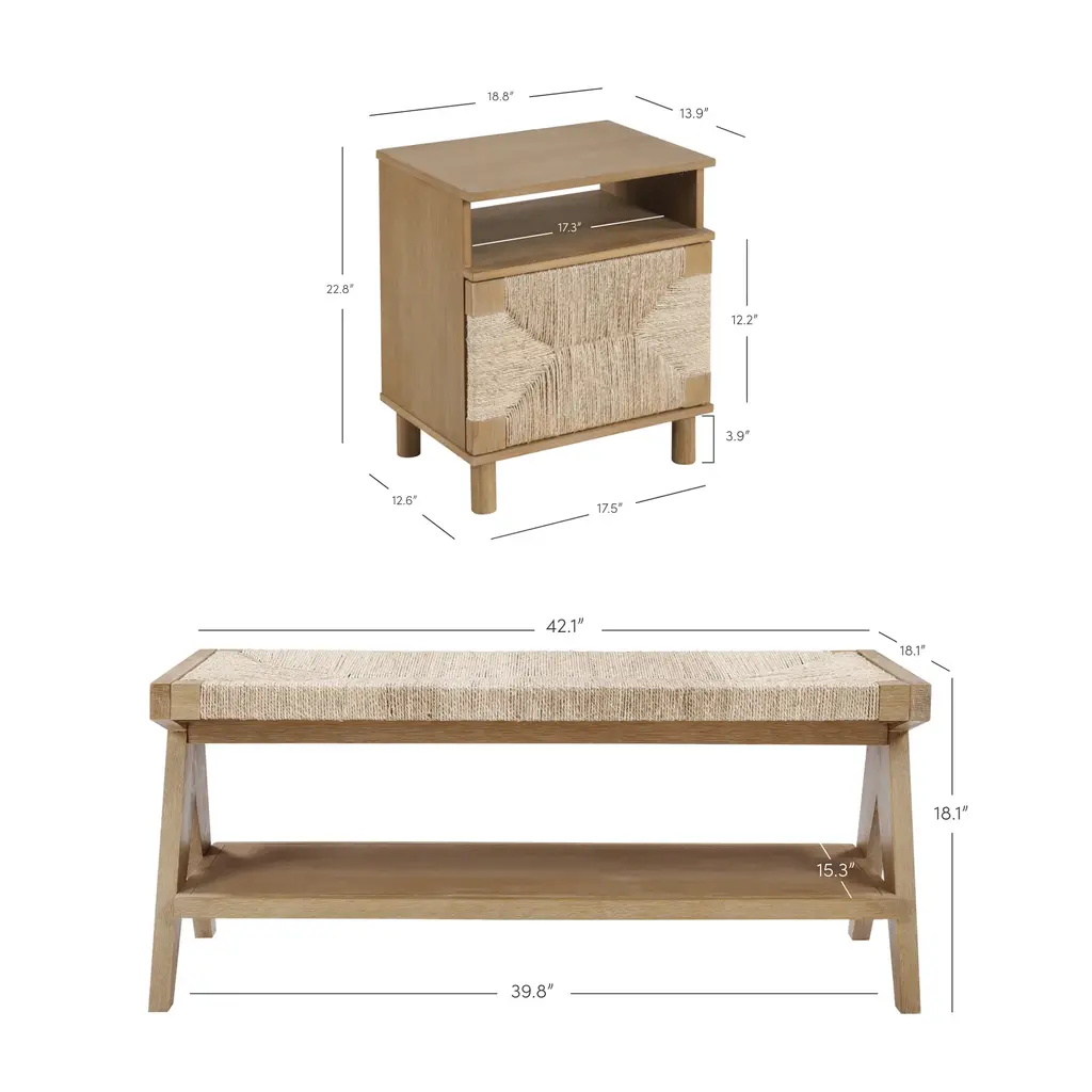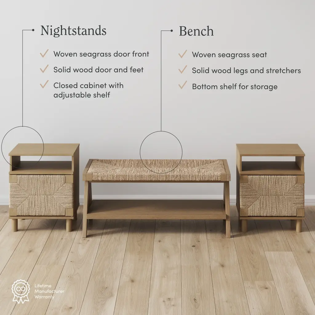 Discover the perfect blend of style and functionality with the Beacon Bedroom Set, designed to transform your bedroom into a serene retreat. This set includes two elegant nightstands and a beautifully crafted bench, each featuring a sophisticated wire-brushed wood veneer and solid wood construction for lasting durability. The nightstands offer a seamless push latch door with a closed cabinet and adjustable shelf, while the hand-woven seagrass bench seat adds a touch of natural charm. With solid wood doors, feet, and legs, and a natural woven seagrass accent, Beacon effortlessly combines timeless design with practical details, making it a standout addition to any bedroom.
