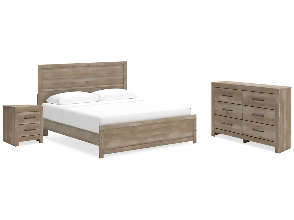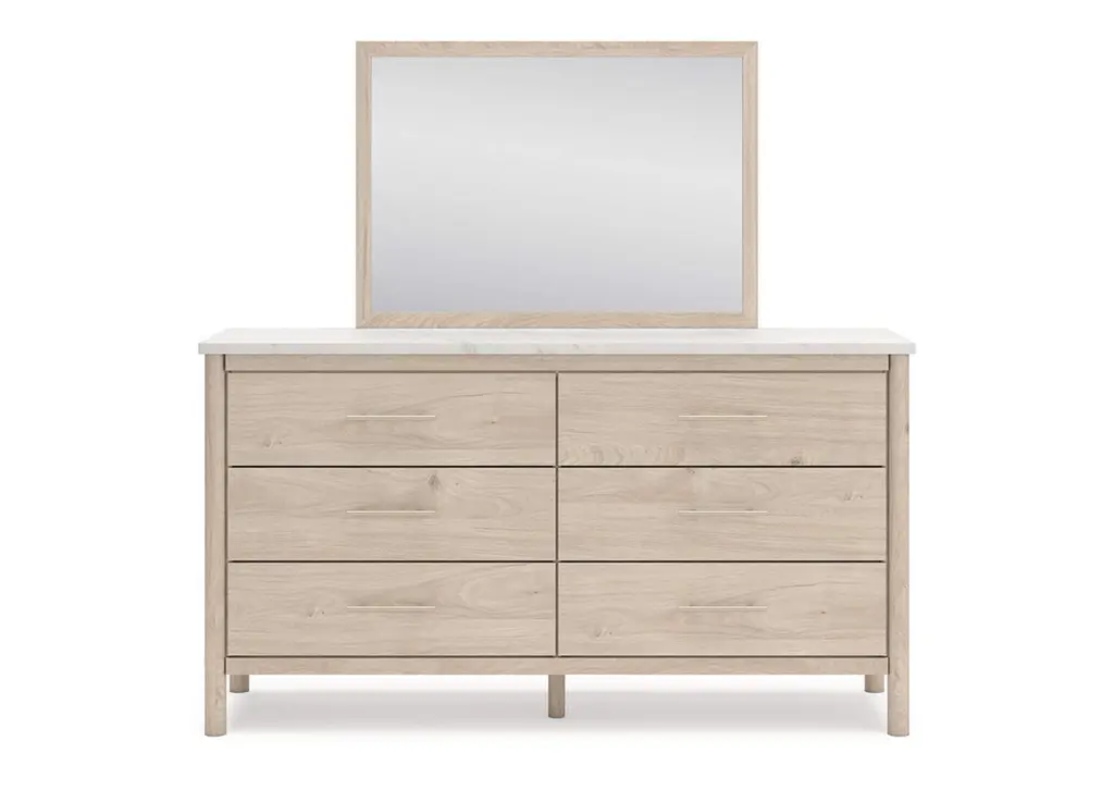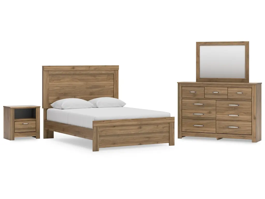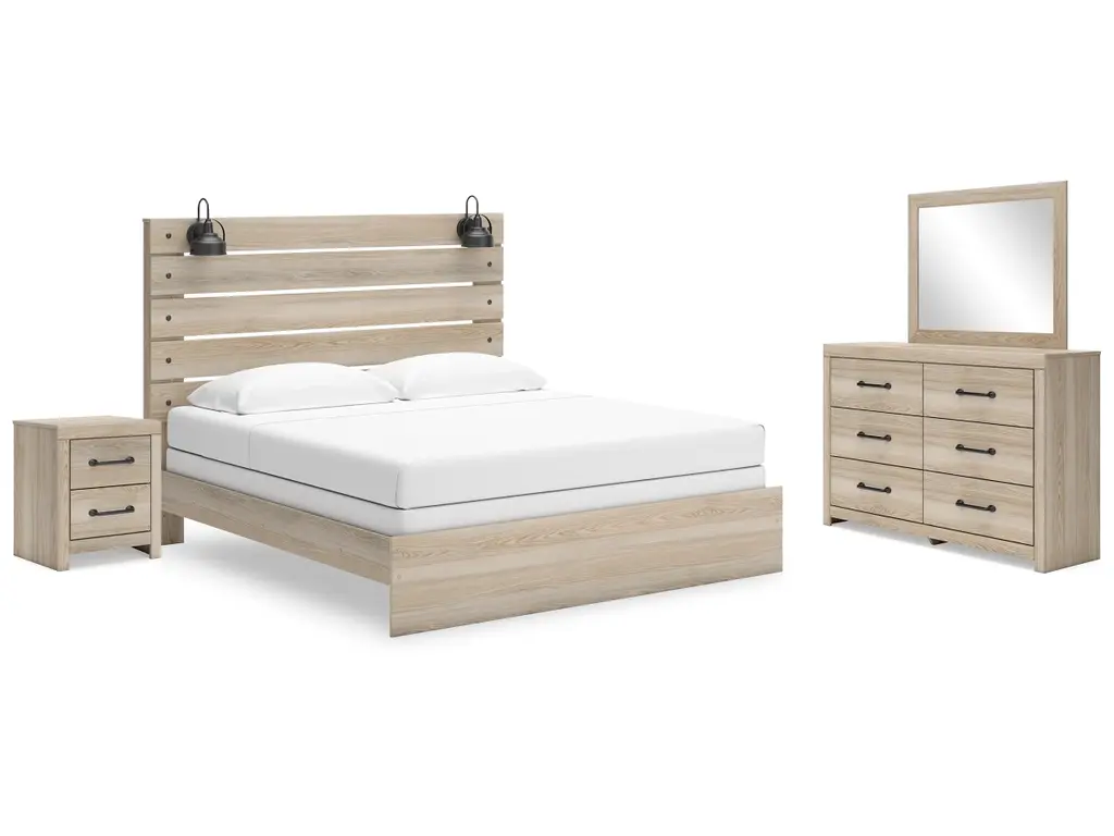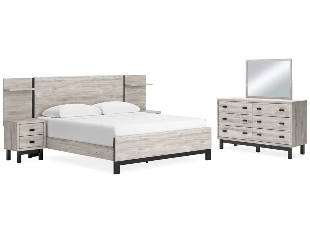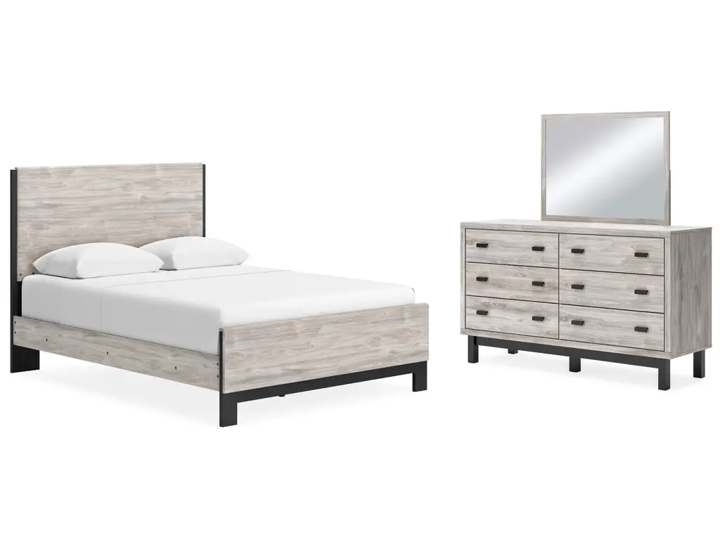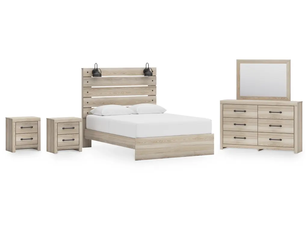 Cadmori Queen Upholstered Panel Bed With Mirrored Dresser And Chest