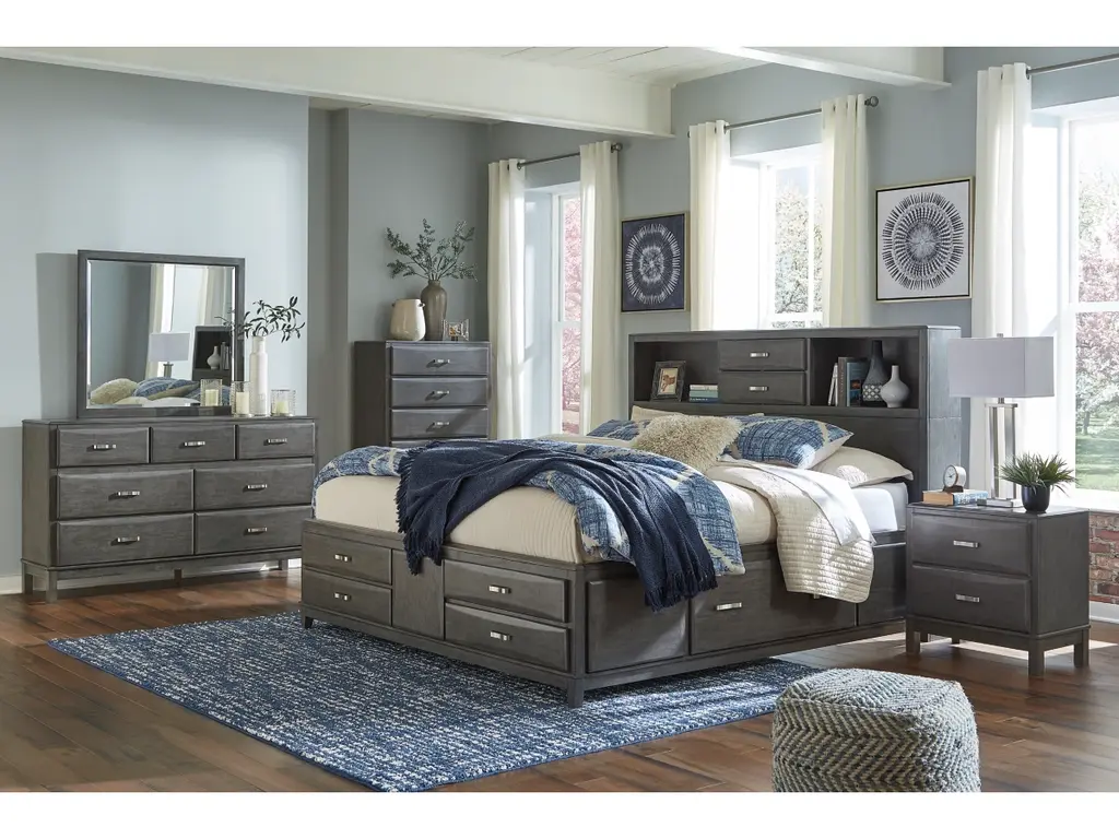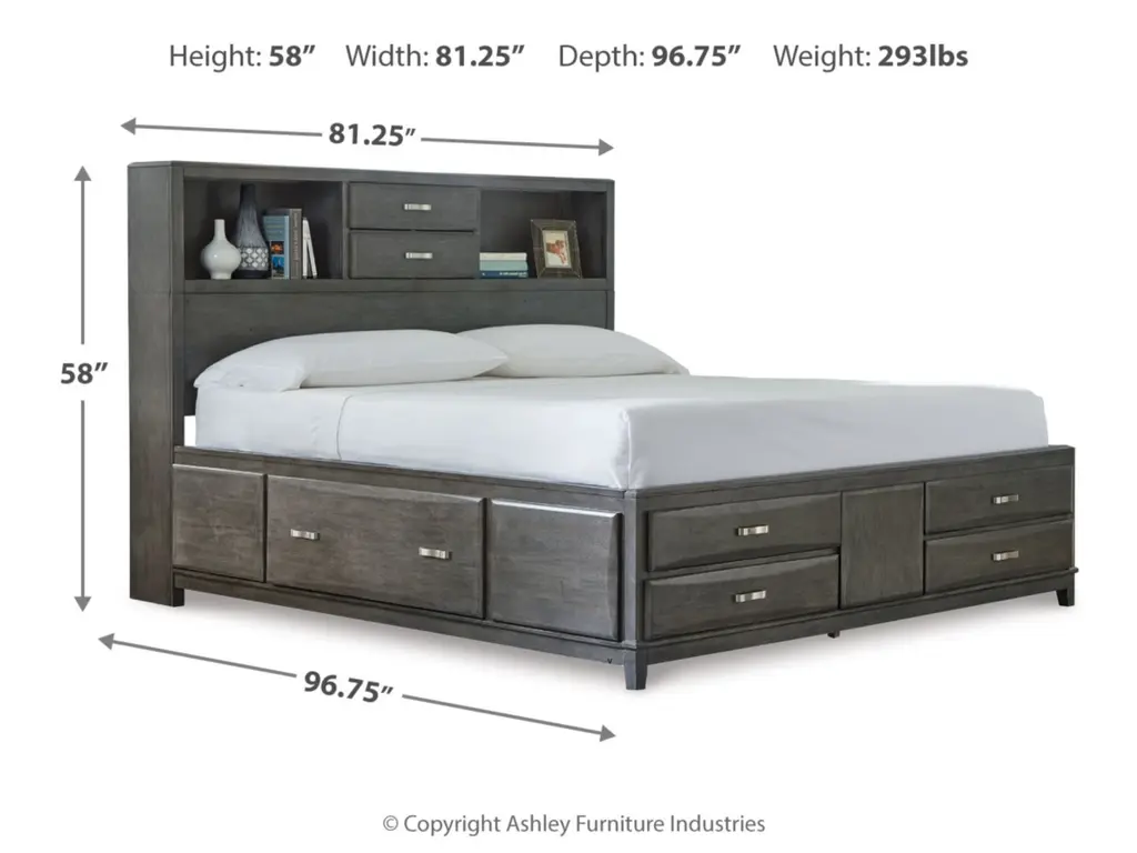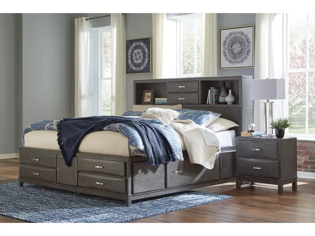 Contemporary style is shaping up beautifully. Designer elements are evident from every angle in the Caitbrook California king storage bed. Quality crafted with dovetail construction, contoured drawers solve small space problems with ease. On each side of the bed a deep drawer provides storage for everything from extra bedding and pillows, to seasonal clothes and more. Additional storage at the top and foot of the bed has you covered from head to toe.