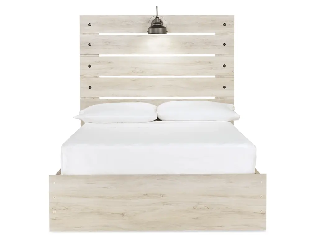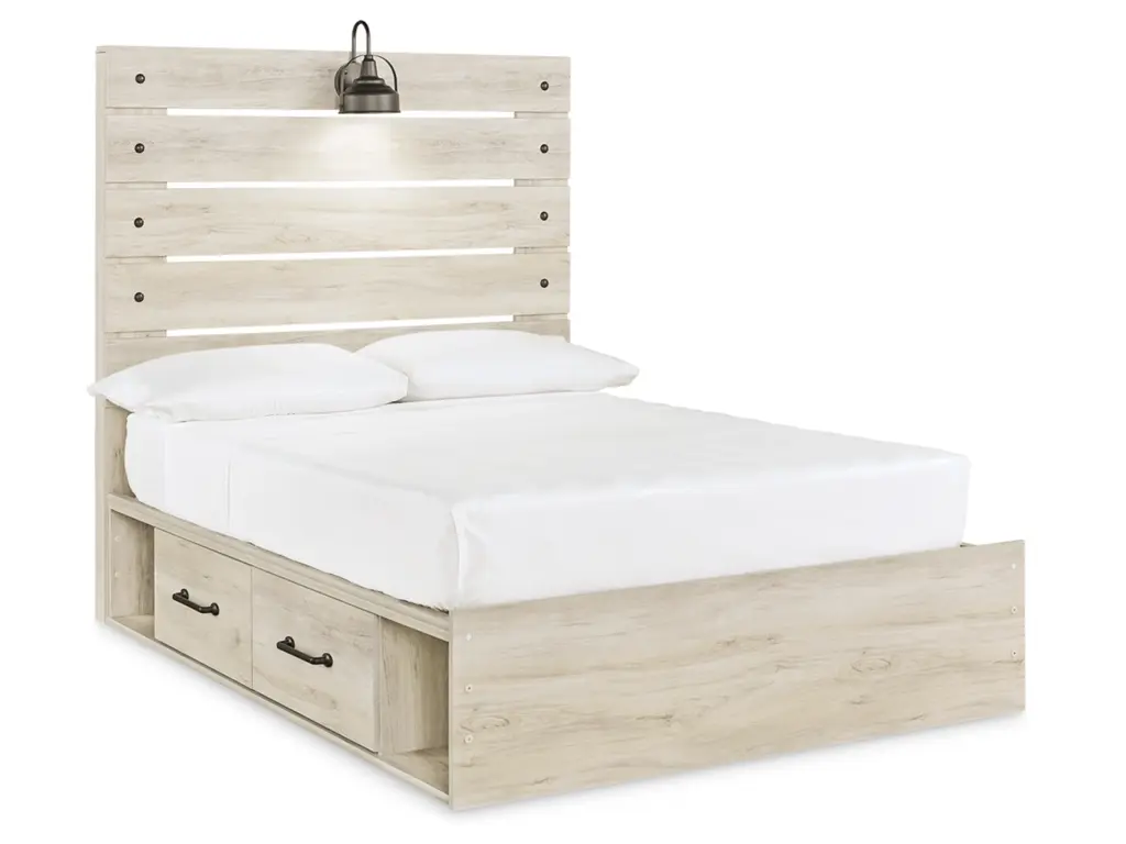What a delightful take on rustic industrial style. Whether modern loft or modern farmhouse, the Cambeck full panel storage bed makes itself at home. The wispy whitewash palette enhances without covering the grain for that weathered look you crave. Love to read in bed? You’re sure to find the retro-chic light sconce and USB plug-ins on the open-slat style headboard such a bright idea. Elongated drawer pulls on the under bed storage drawers elevate the aesthetic.