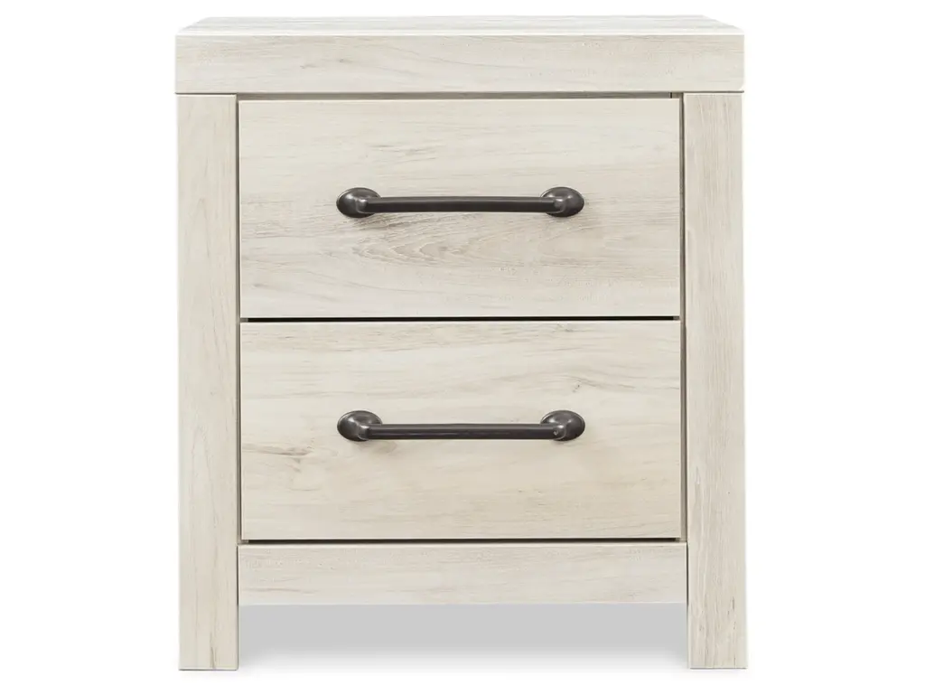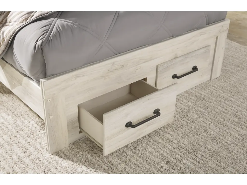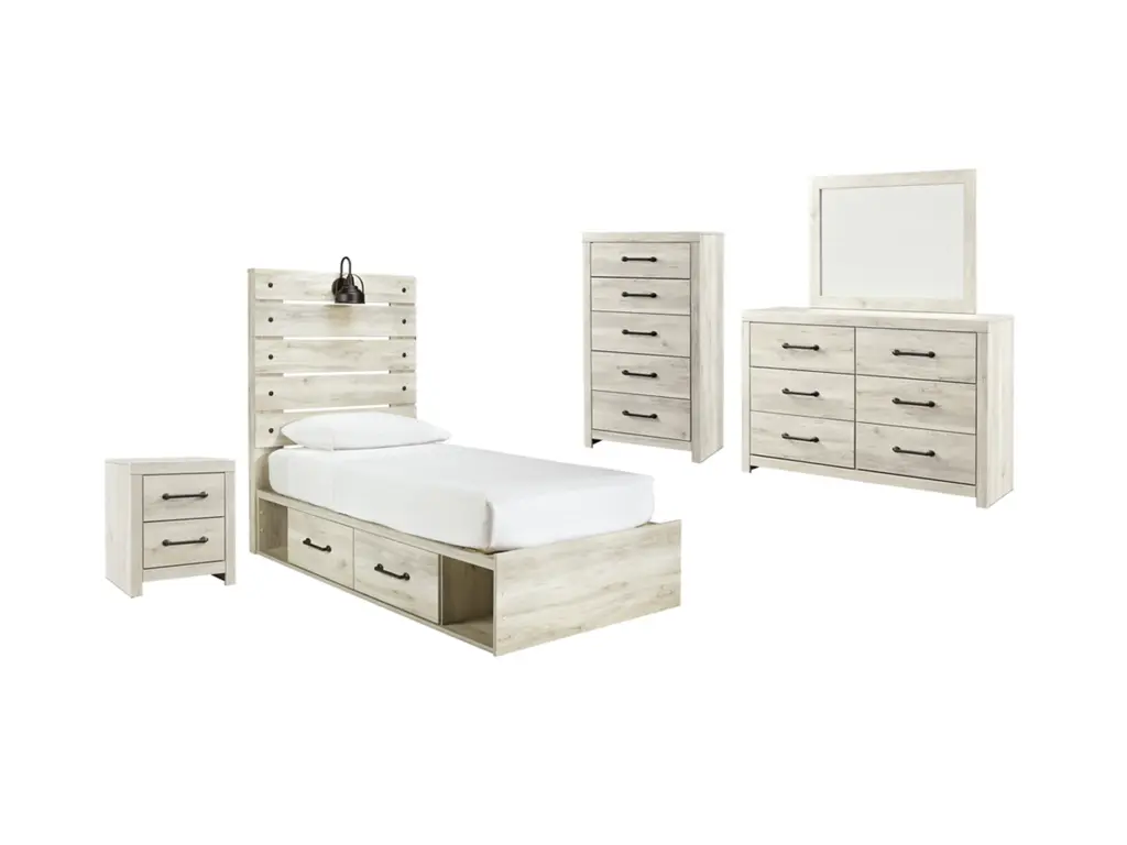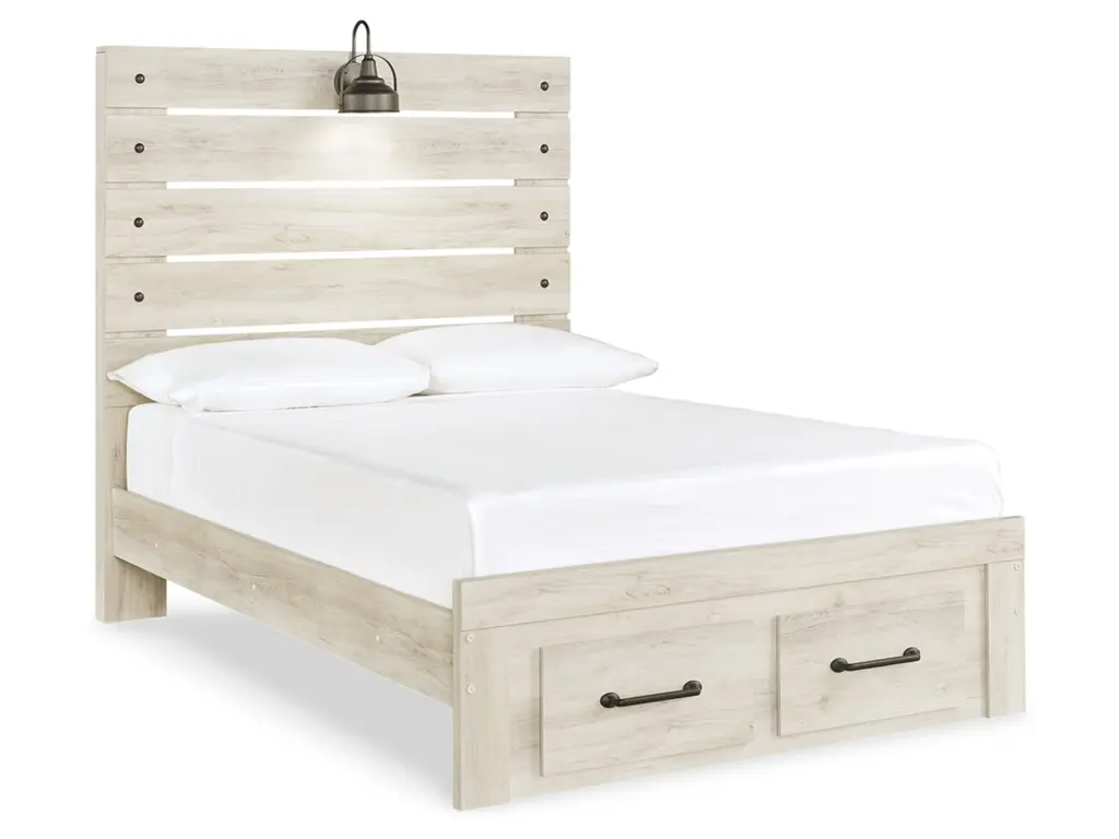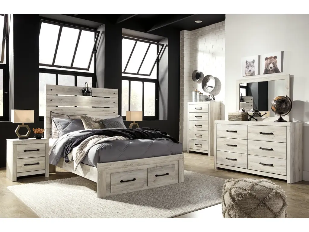Whether you lean towards modern loft or modern farmhouse, the Cambeck panel storage bed, nightstand, chest of drawers and dresser with mirror tip the balance in your favor. The wispy whitewash finish enhances the style without covering the grain for that weathered look you just can’t get enough of. Love to read in bed? You’re sure to find the retro-chic light sconce and USB plug-ins on the open-slat style headboard to be a totally bright idea, while the elongated metal drawer pulls really elevate the aesthetic. What a delightful take on rustic industrial style.