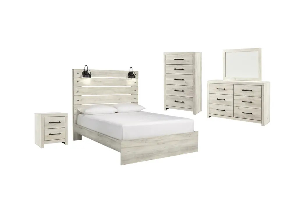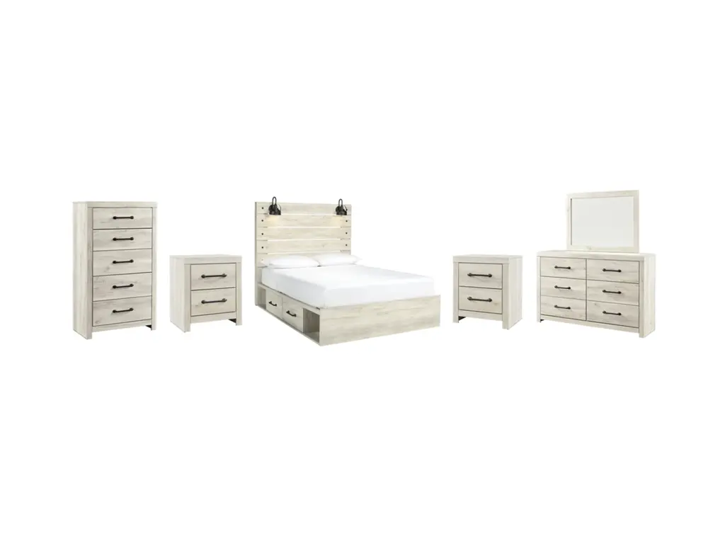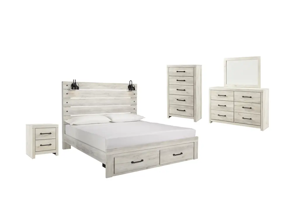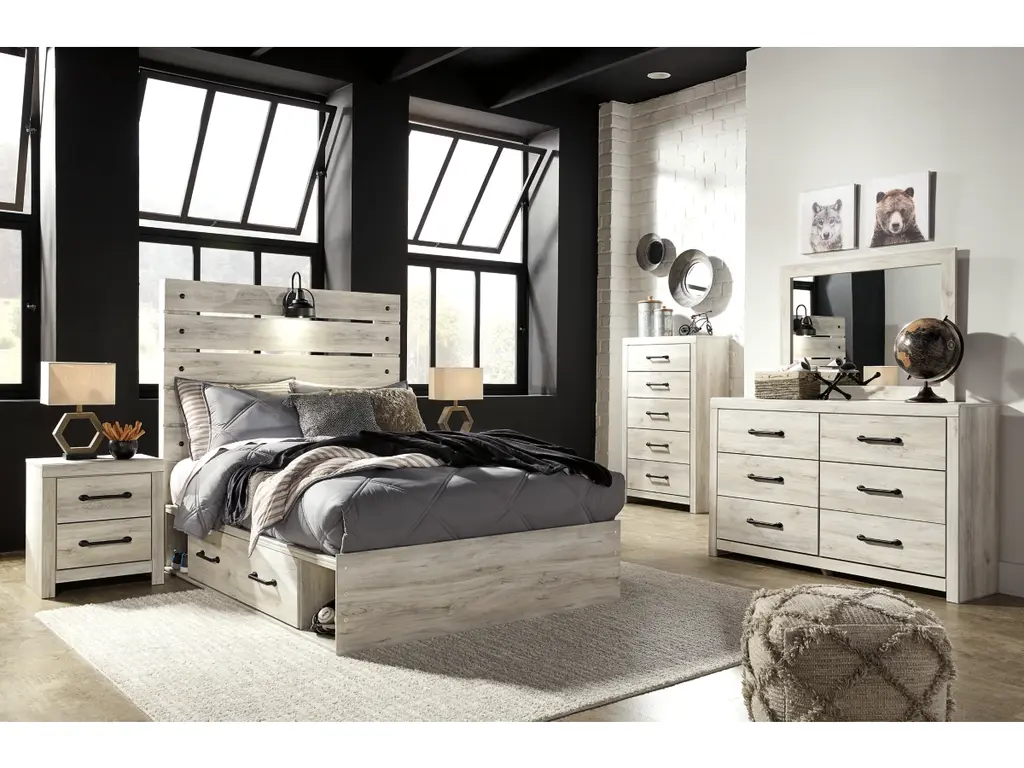 Whether you lean towards modern loft or modern farmhouse, the Cambeck panel storage bed, nightstand, chest of drawers and dresser with mirror tip the balance in your favor. The wispy whitewash finish enhances the style without covering the grain for that weathered look you just can’t get enough of. Love to read in bed? You’re sure to find the retro-chic light sconce and USB plug-ins on the open-slat style headboard to be a totally bright idea, while the elongated metal drawer pulls really elevate the aesthetic. What a delightful take on rustic industrial style.