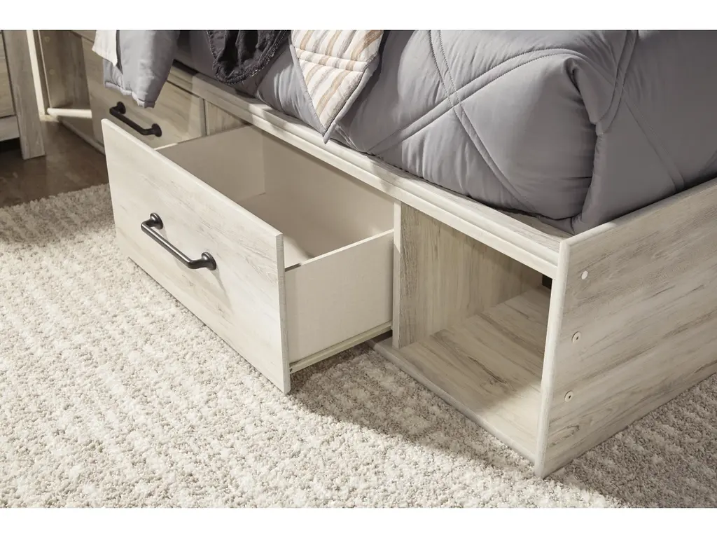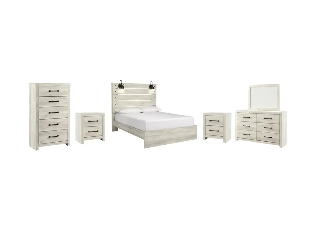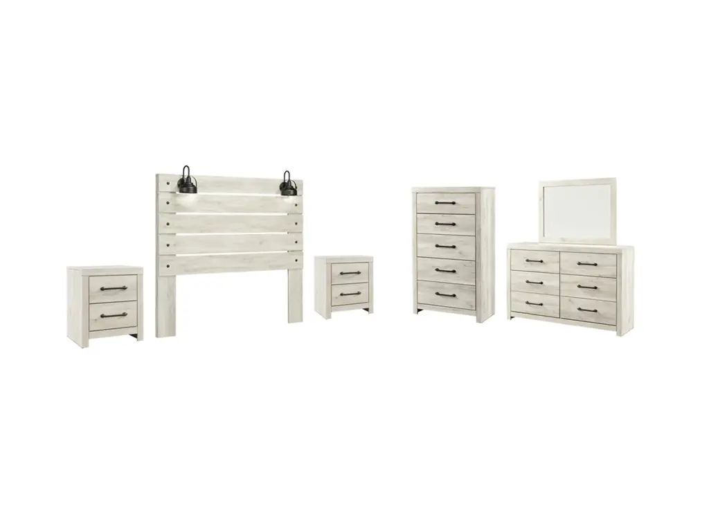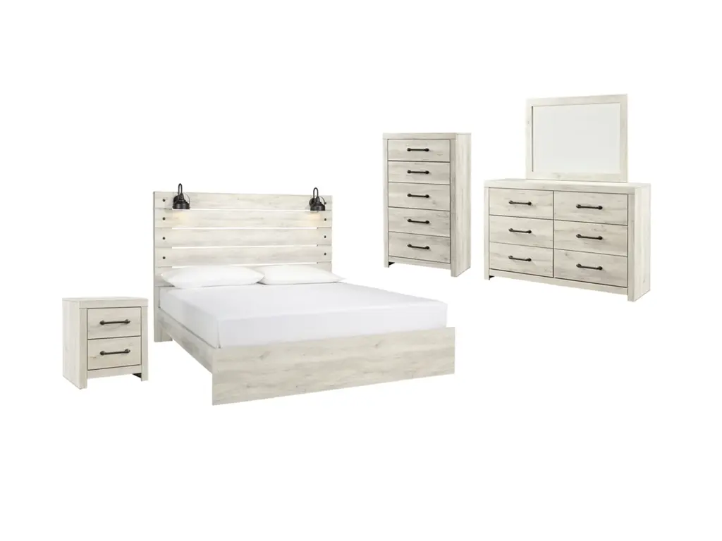 Whether you lean towards modern loft or modern farmhouse, the Cambeck panel storage bed, nightstand, chest of drawers and dresser with mirror tip the balance in your favor. The wispy whitewash finish enhances the style without covering the grain for that weathered look you just can’t get enough of. Love to read in bed? You’re sure to find the retro-chic light sconce and USB plug-ins on the open-slat style headboard to be a totally bright idea, while the elongated metal drawer pulls really elevate the aesthetic. What a delightful take on rustic industrial style.