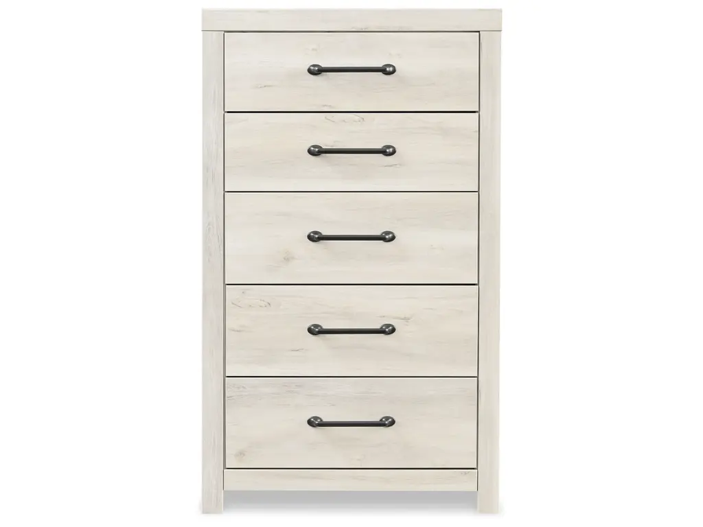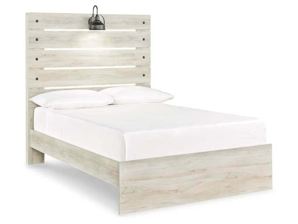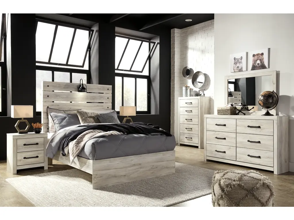 Whether you lean towards modern loft or modern farmhouse, the Cambeck panel bed, two nightstands, chest of drawers and dresser with mirror tip the balance in your favor. The wispy whitewash finish enhances the style without covering the grain for that weathered look you just can’t get enough of. Love to read in bed? You’re sure to find the retro-chic light sconce and USB plug-ins on the open-slat style headboard to be a totally bright idea, while the elongated metal drawer pulls really elevate the aesthetic. What a delightful take on rustic industrial style.