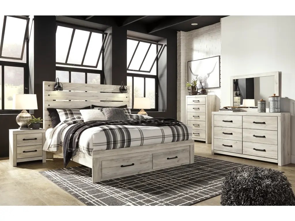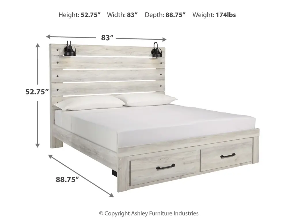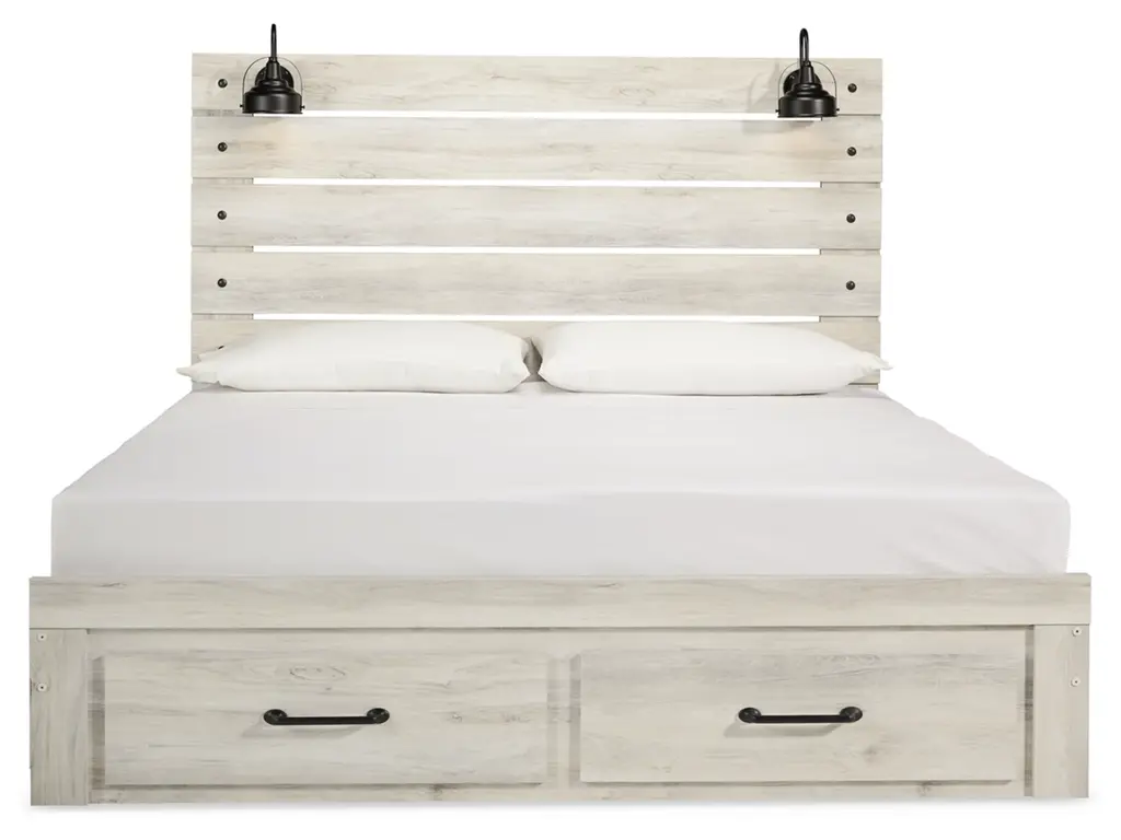 What a delightful take on rustic industrial style. Whether modern loft or modern farmhouse, the Cambeck queen panel bed makes itself at home. The wispy whitewash palette enhances without covering the grain for that weathered look you crave. Love to read in bed? You’re sure to find the retro-chic light sconces and USB plug-ins on the open-slat style headboard such a bright idea.