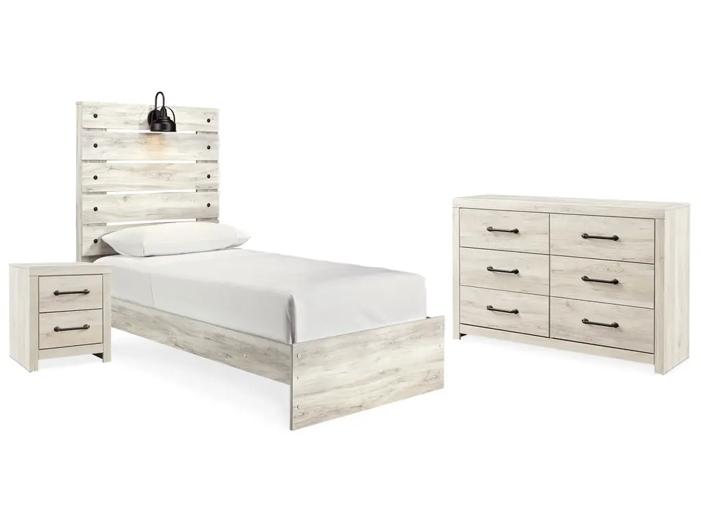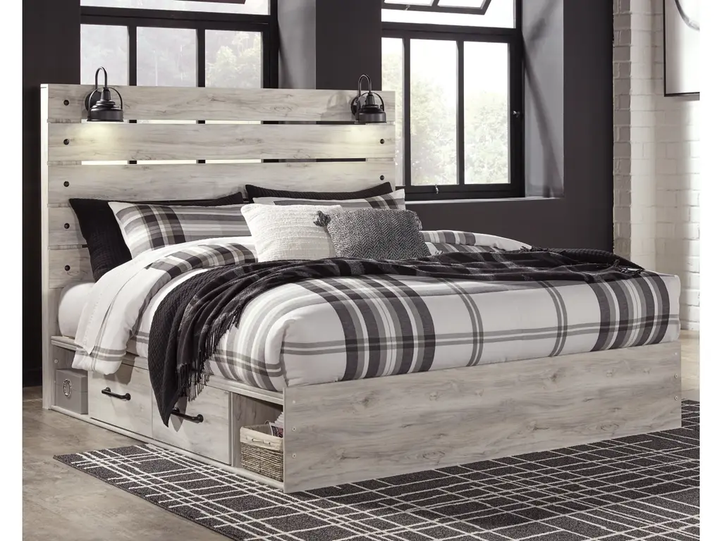 Whether you lean towards modern loft or modern farmhouse, the Cambeck panel storage bed and dresser with mirror tip the balance in your favor. The wispy whitewash finish enhances the style without covering the grain for that weathered look you just can’t get enough of. Love to read in bed? You’re sure to find the retro-chic light sconces and USB plug-ins on the open-slat style headboard to be a totally bright idea while the elongated metal pulls on the dresser and underbed drawers really elevate the aesthetic. What a delightful take on rustic industrial style.