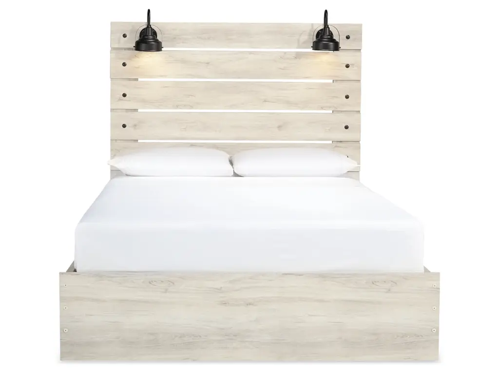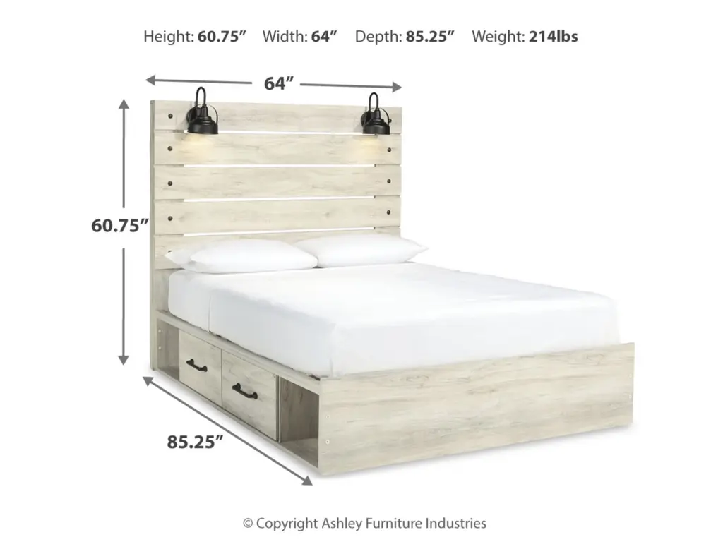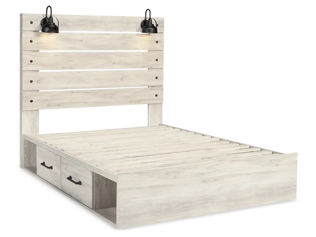 What a delightful take on rustic industrial style. Whether modern loft or modern farmhouse, the Cambeck queen panel storage bed makes itself at home. The wispy whitewash palette enhances without covering the grain for that weathered look you crave. Love to read in bed? You’re sure to find the retro-chic light sconces and USB plug-ins on the open-slat style headboard such a bright idea. Elongated drawer pulls on the under bed storage drawers elevate the aesthetic.