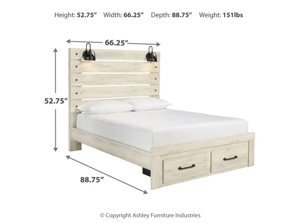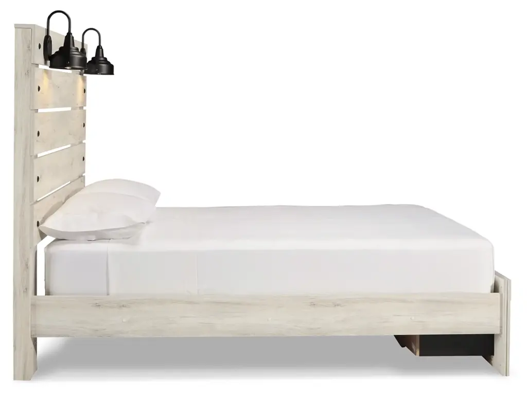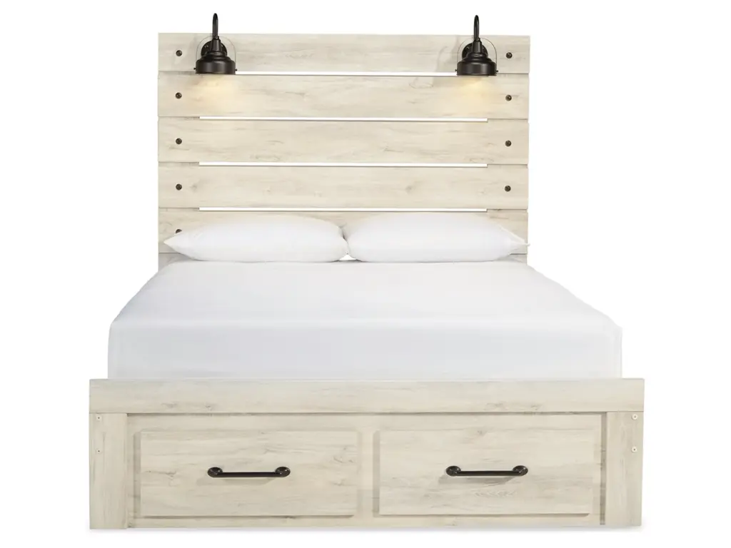 What a delightful take on rustic industrial style. Whether modern loft or modern farmhouse, the Cambeck queen panel storage bed makes itself at home. The wispy whitewash palette enhances without covering the grain for that weathered look you crave. Love to read in bed? You’re sure to find the retro-chic light sconces and USB plug-ins on the open-slat style headboard such a bright idea. Elongated metal drawer pulls on the footboard storage drawers elevate the aesthetic.