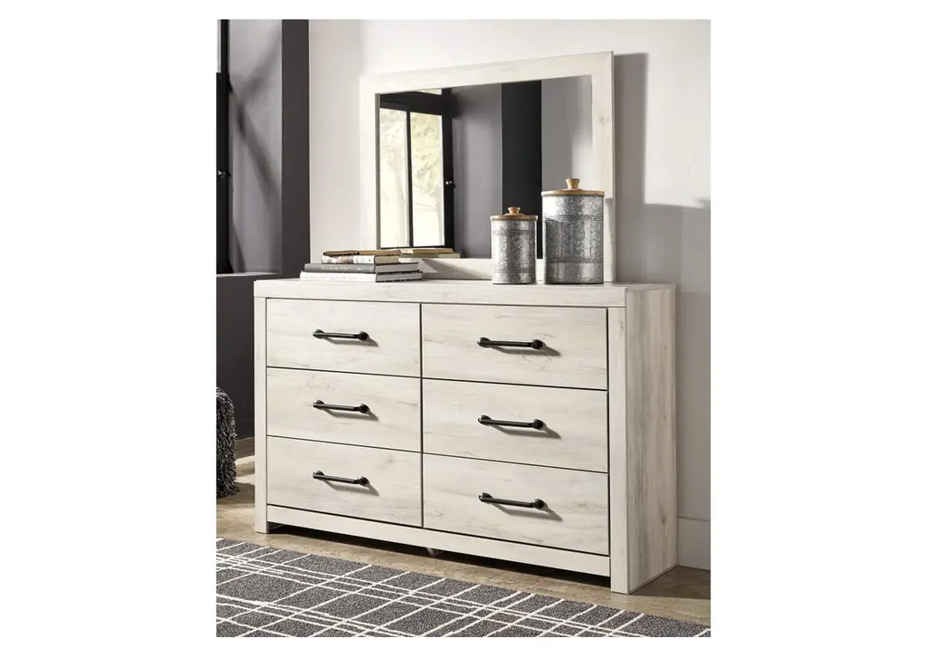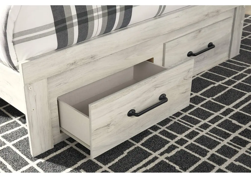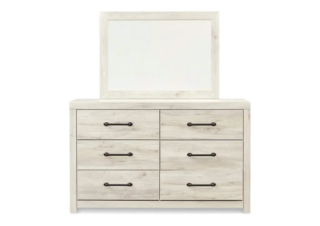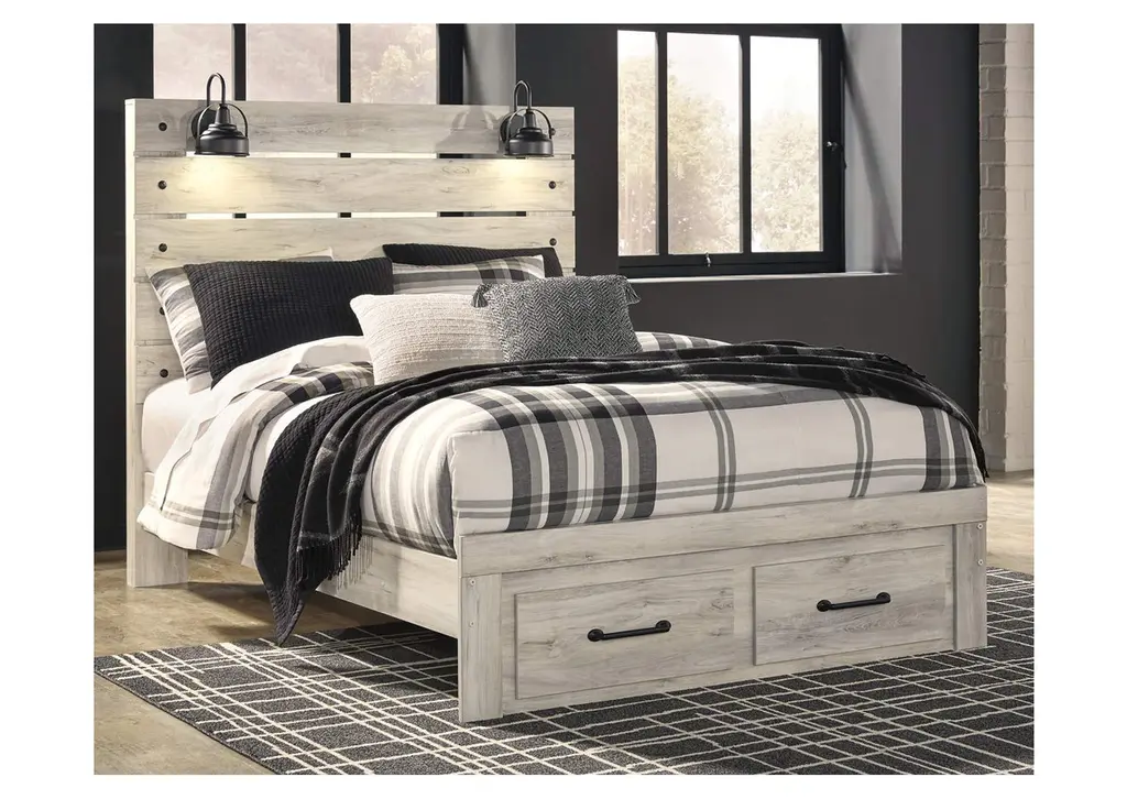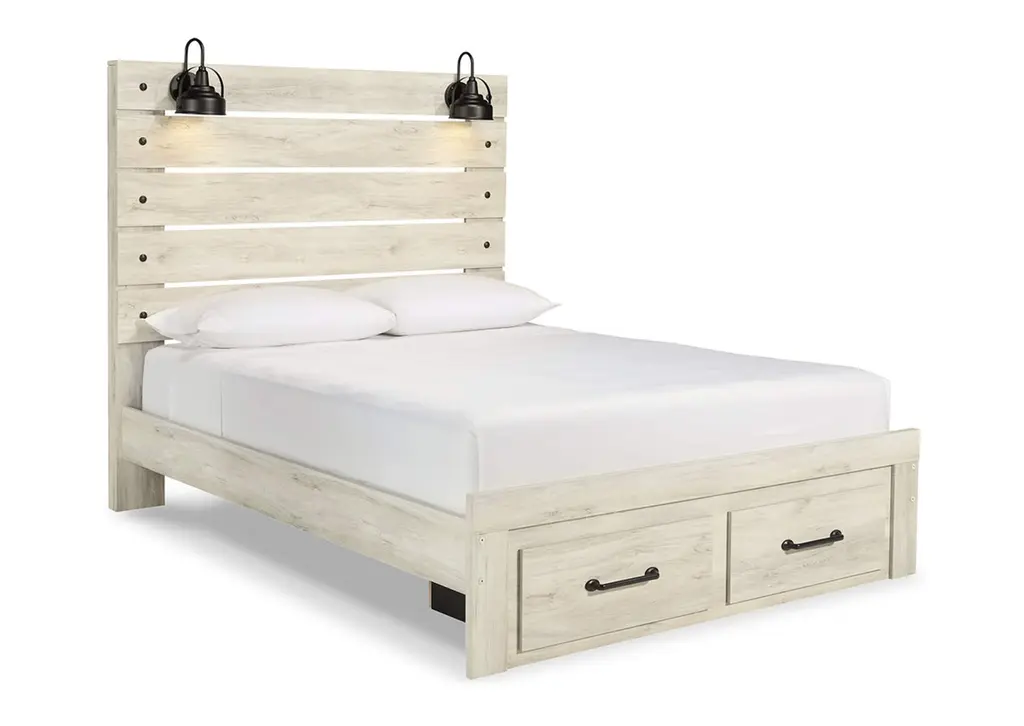 Whether you lean towards modern loft or modern farmhouse, the Cambeck panel storage bed and dresser with mirror tip the balance in your favor. The wispy whitewash finish enhances the style without covering the grain for that weathered look you just can’t get enough of. Love to read in bed? You’re sure to find the retro-chic light sconces and USB plug-ins on the open-slat style headboard to be a totally bright idea while the elongated metal drawer pulls really elevate the aesthetic. What a delightful take on rustic industrial style.