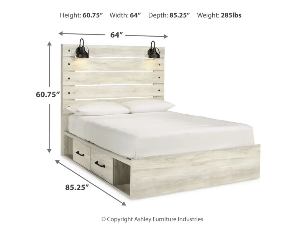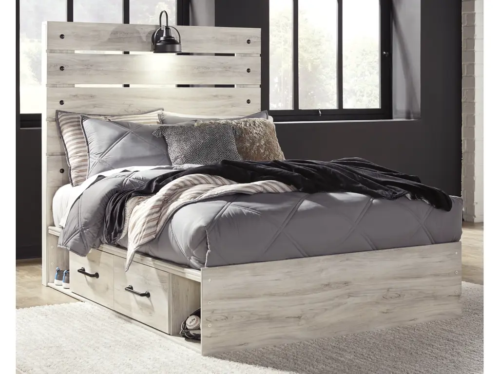 What a delightful take on rustic industrial style. Whether modern loft or modern farmhouse, the Cambeck queen panel storage bed makes itself at home. The wispy whitewash palette enhances without covering the grain for that weathered look you crave. Love to read in bed? You’re sure to find the retro-chic light sconces and USB plug-ins on the open-slat style headboard such a bright idea. Elongated drawer pulls on the under bed storage drawers elevate the aesthetic.