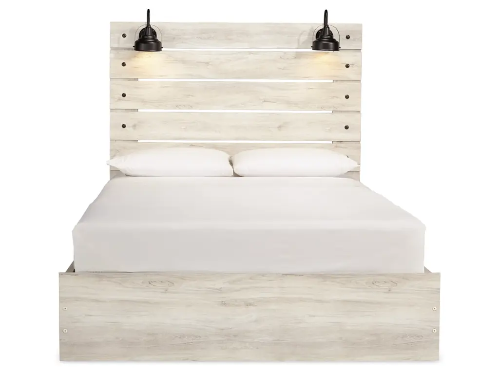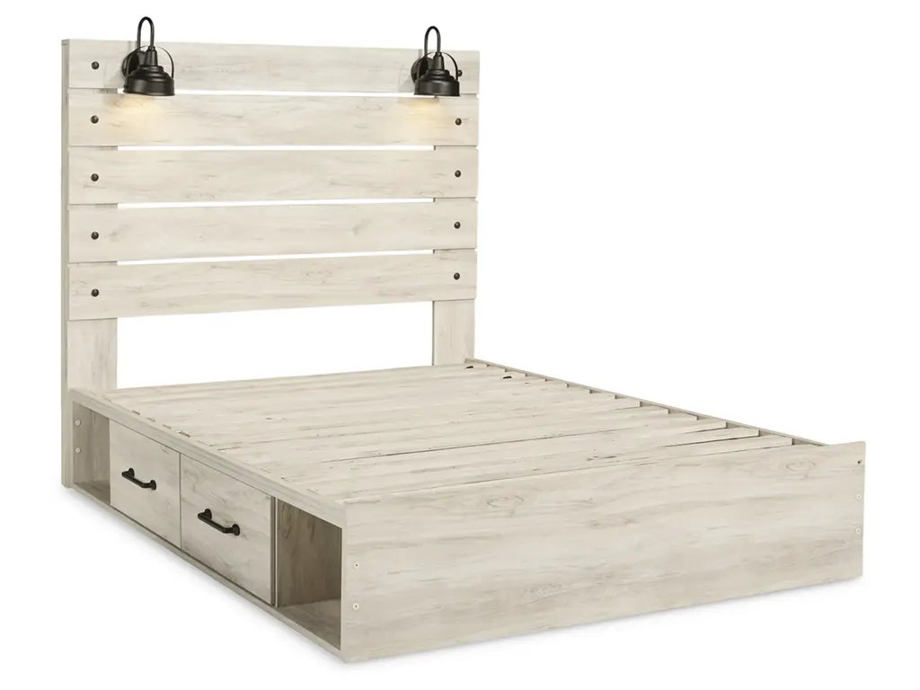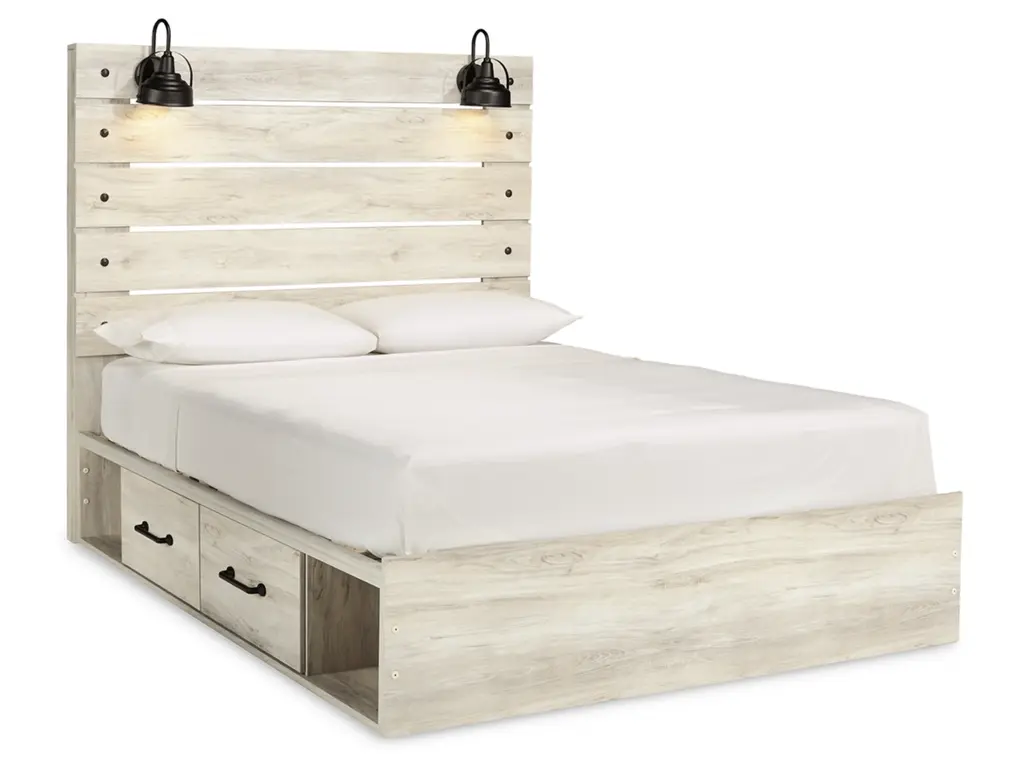 What a delightful take on rustic industrial style. Whether modern loft or modern farmhouse, the Cambeck queen panel storage bed makes itself at home. The wispy whitewash palette enhances without covering the grain for that weathered look you crave. Love to read in bed? You’re sure to find the retro-chic light sconces and USB plug-ins on the open-slat style headboard such a bright idea. Elongated drawer pulls on the under bed storage drawers elevate the aesthetic.