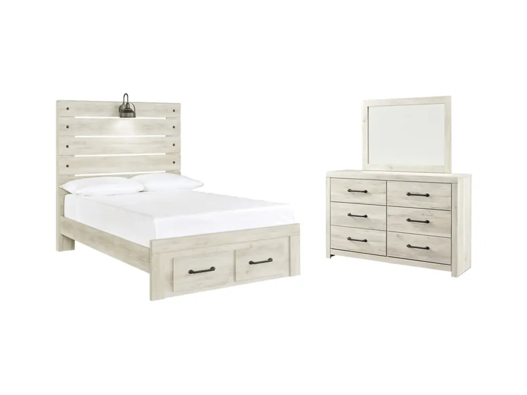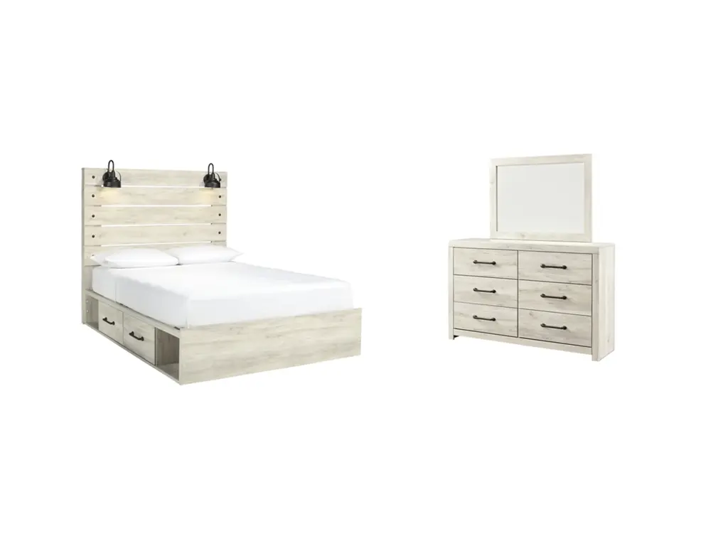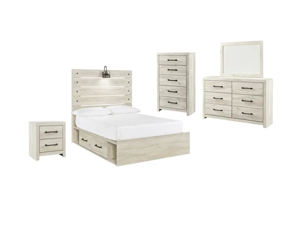 Whether you lean towards modern loft or modern farmhouse, the Cambeck panel storage bed, chest of drawers and dresser with mirror tip the balance in your favor. The wispy whitewash finish enhances the style without covering the grain for that weathered look you just can’t get enough of. Love to read in bed? You’re sure to find the retro-chic light sconce and USB plug-ins on the open-slat style headboard to be a totally bright idea while the elongated metal drawer pulls really elevate the aesthetic. What a delightful take on rustic industrial style.