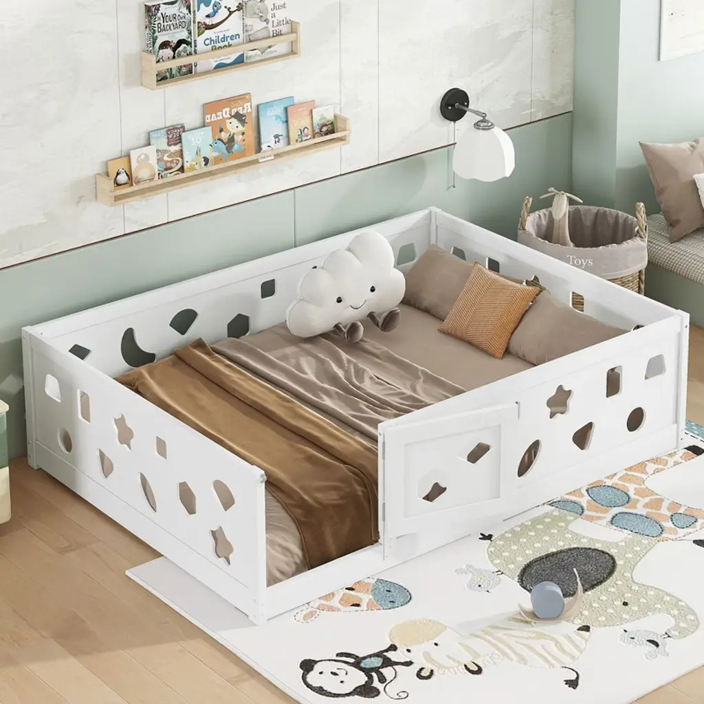 Blending practicality and creativity, this Montessori floor bed features a geometric fence design that adds a playful yet safe touch to your child’s room. The 22-inch-high solid wood guardrails with baffle detailing help prevent accidental falls and keep toys from slipping out. Made from premium poplar wood, the frame is smooth, sturdy, and durable. The open guardrail and secure door allow kids to climb in and out easily, while ensuring added safety. With no box spring needed, this multifunctional bed creates a cozy space for sleep, play, and imagination.