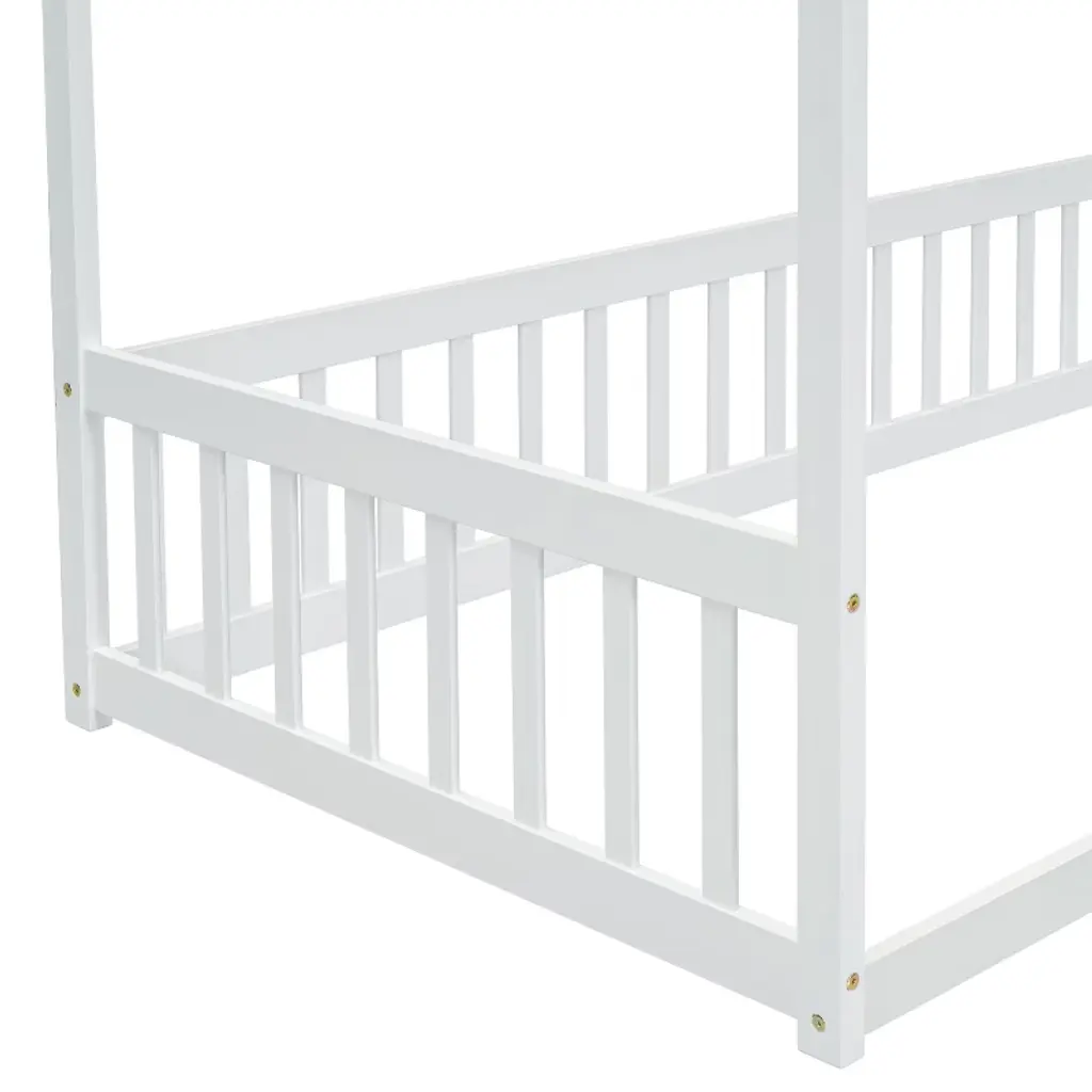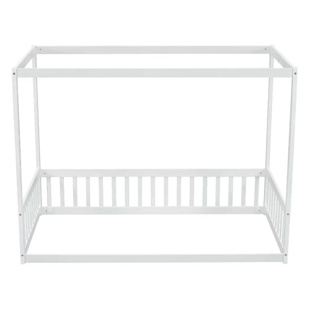 This premium pine wood floor bed features a sleek wooden canopy frame that sparks endless imagination and can be decorated with curtains or ornaments. Designed with guardrails on three sides and one open side for easy access, it ensures safety and stability for restful sleep. The sturdy fence supports a standard mattress on the floor, creating a cozy, private space perfect for play and reading. Minimalistic yet practical, this floor bed combines style with function. Delivered in one package with clear instructions and hardware, assembly is quick and hassle-free. Mattress (under 6 inches thick) sold separately.