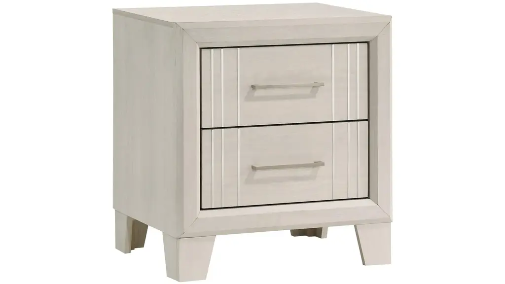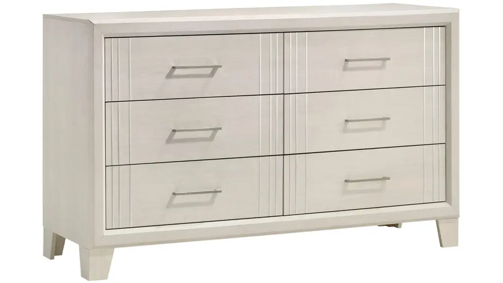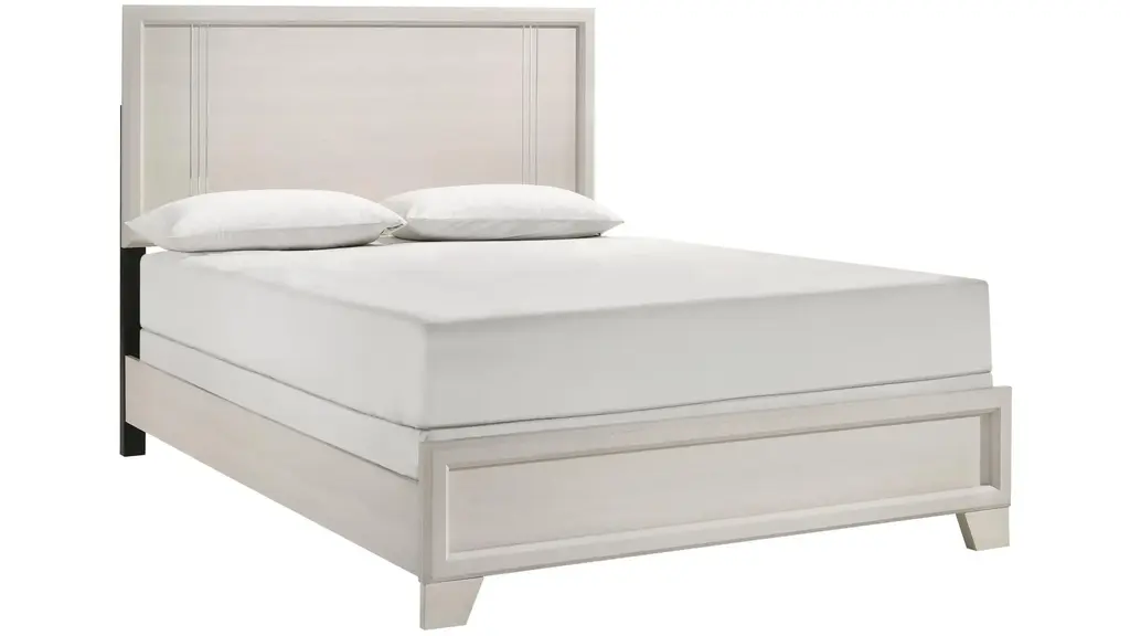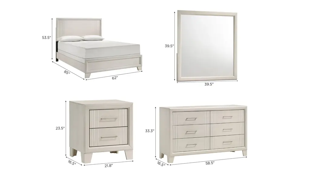 The Charlie 4-pc. Bedroom Set offers a sophisticated blend of modern design and refined style, perfect for elevating your sleeping space. Featuring sleek, minimalist silhouettes and a crisp white finish, the suite exudes contemporary charm with timeless appeal. At its center, a striking panel bed with a bold, prominent headboard serves as the focal point, combining durability with statement-making style. Complementing the bed, the accompanying case pieces provide generous storage through smooth-gliding drawers, elegantly accented with sleek silver-toned hardware. This 4 piece set includes the bed, dresser, dresser mirror and nightstand.