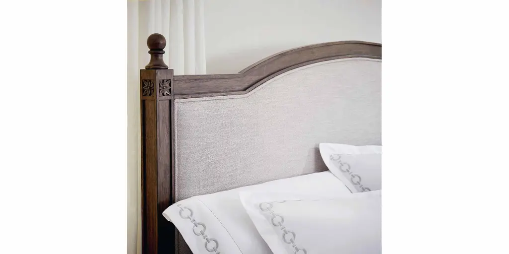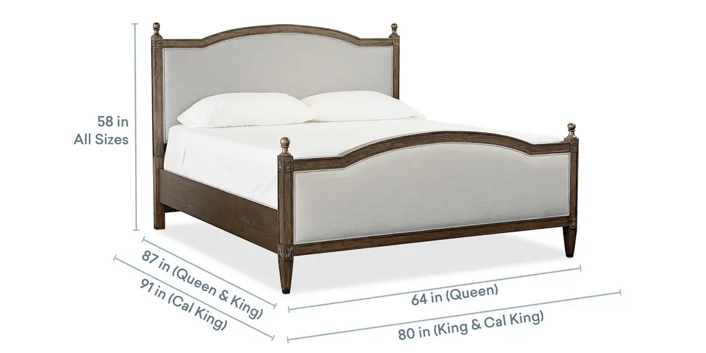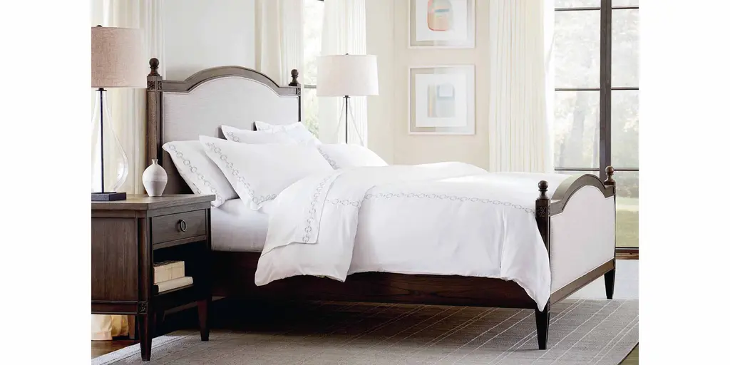 The Charlotte Upholstered Bed with Footboard has all the charm of old-world design with a modern twist. Traditional details include the understated carved rosettes and recessed lines in the beds gently tapered legs. Bedposts with simply turned finials and carved rosettes accent the gently curved arch. Modern finishes highlight the details and grain of the elm veneer with moderate distressing and glaze. The upholstered headboard softens the look with heathered texture fabric in neutral Oatmeal. Choose dark Tavern finish or soft Washed Elm, and select a low wood footboard or tall, arched upholstered footboard to complete the look.