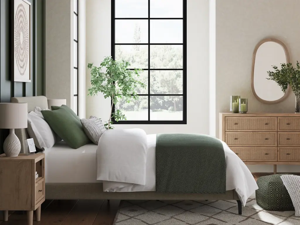 Clean-lined and contemporary—but far from stark—the Cielden queen upholstered bed with roll slats is a fresh style awakening. Its sleekly simple low profile and soft gray woven fabric play perfectly with the modern aesthetic and calming mood you long for in your tranquil retreat.