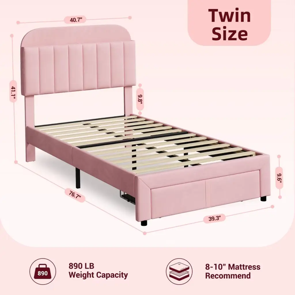 Twin Bed Frame for Kids, Upholstered Platform Bed with Large Storage Drawer and Bookcase Headboard, Boys Bed, Noise-Free, Easy Assembly, No Box Spring Needed