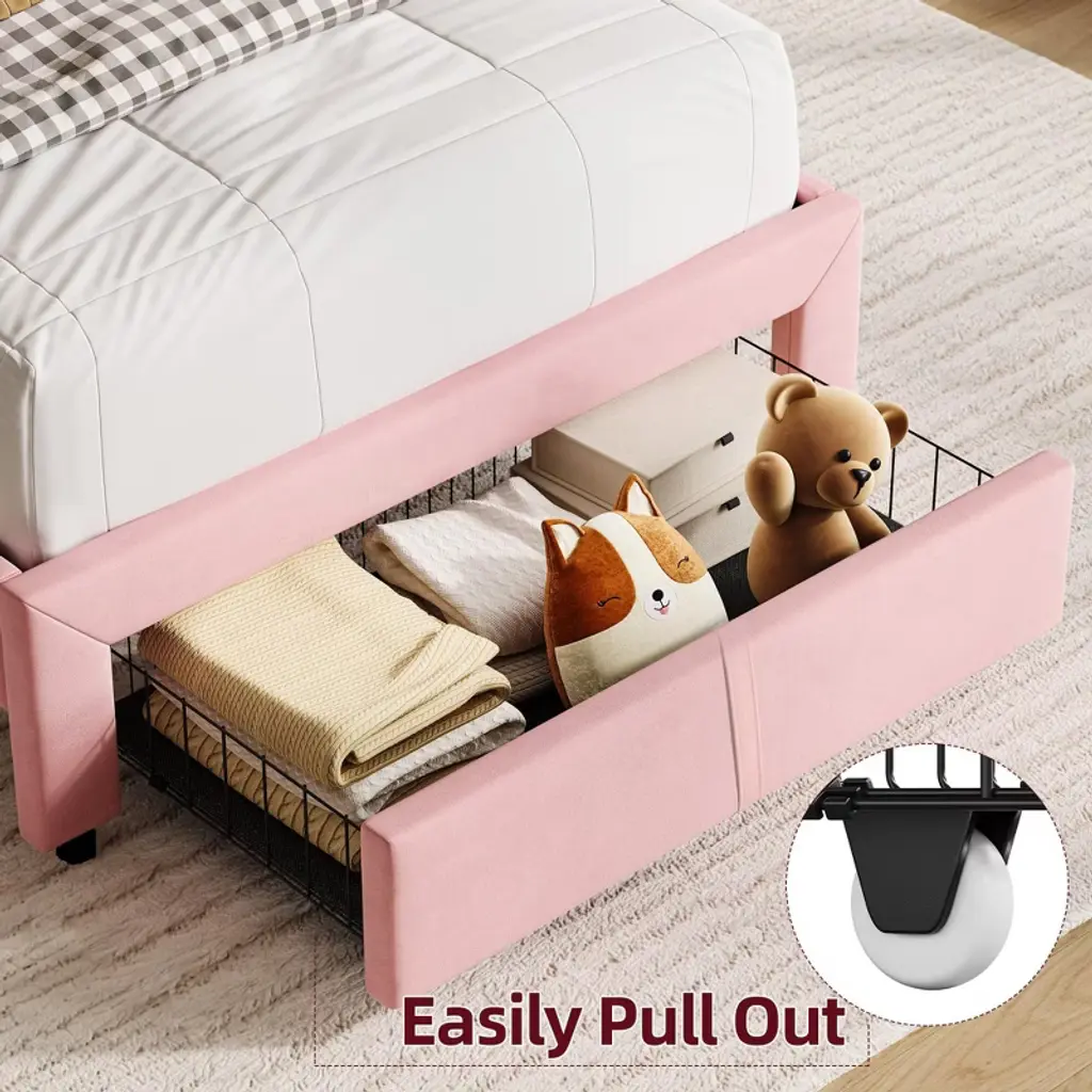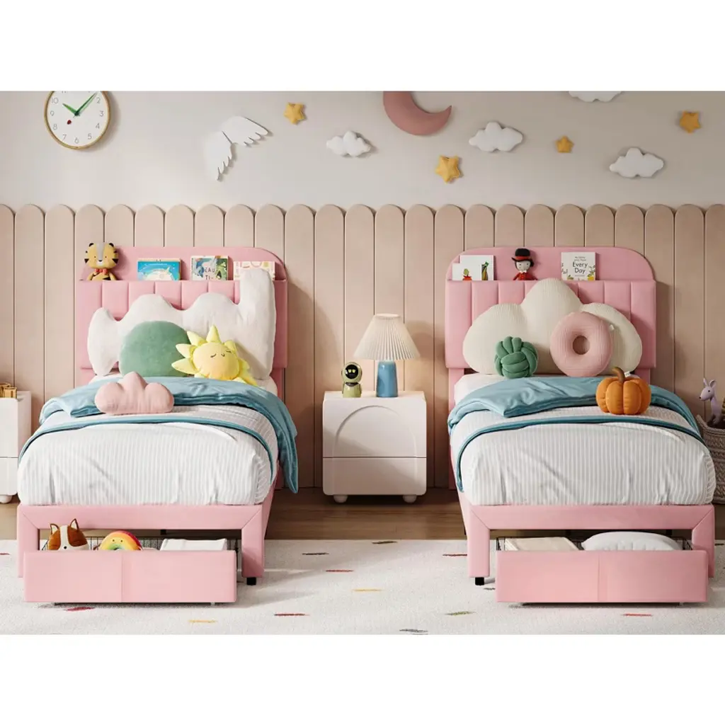 Coolmee Twin Bed Frame For Kids, Upholstered Platform Bed With Large Storage Drawer And Bookcase Headboard, Boys Bed, Noise-free, Easy Assembly