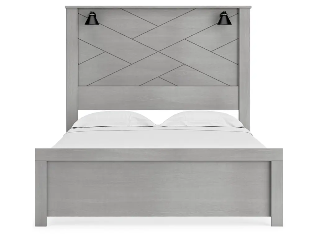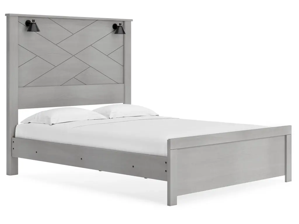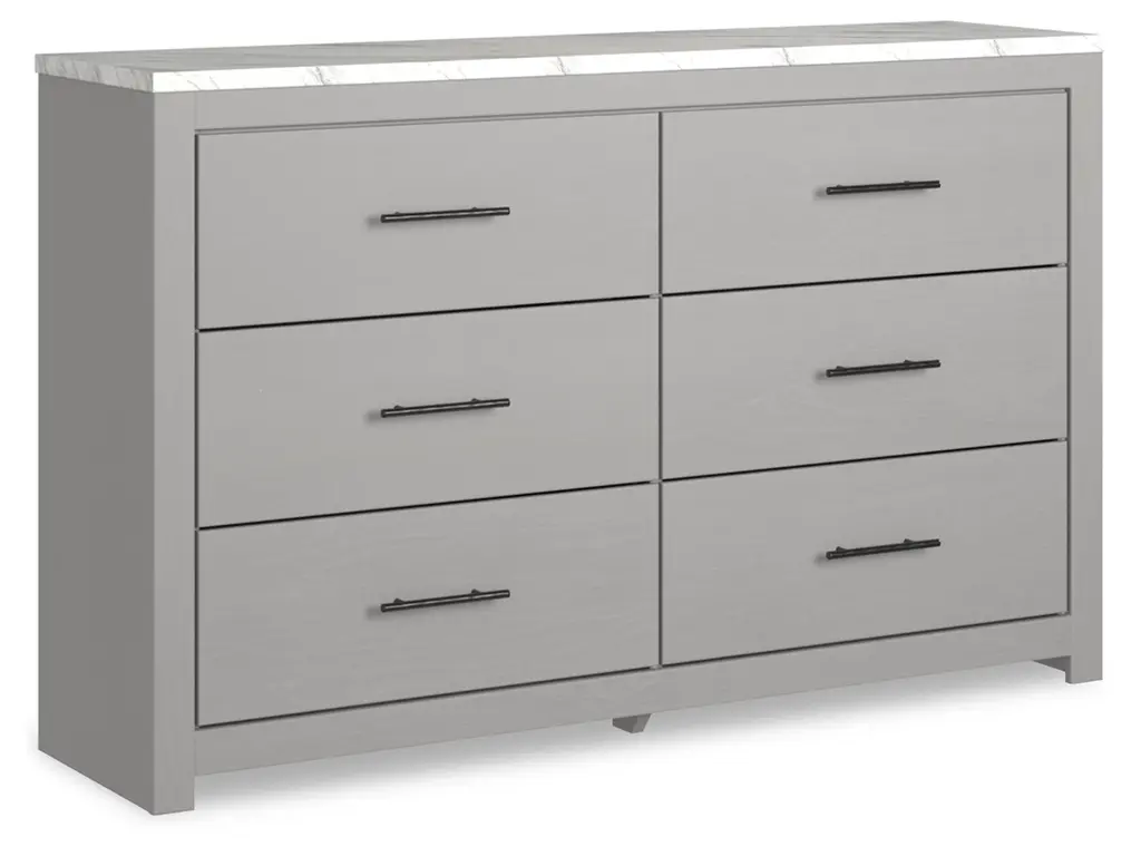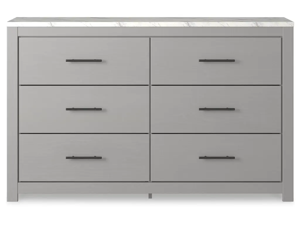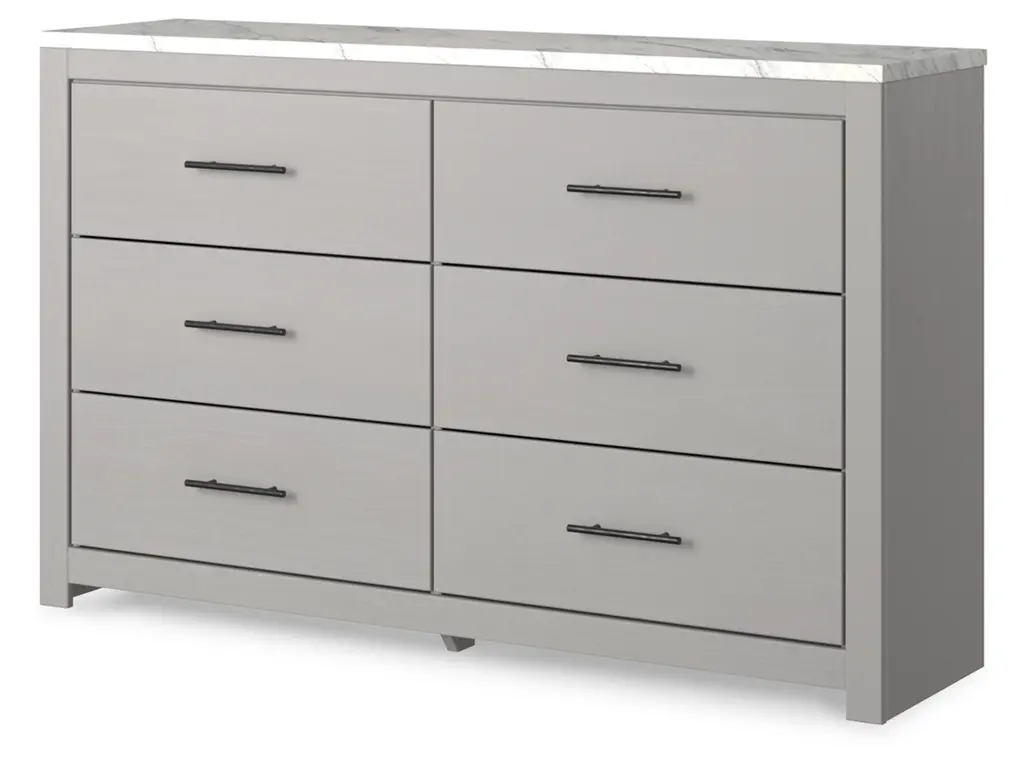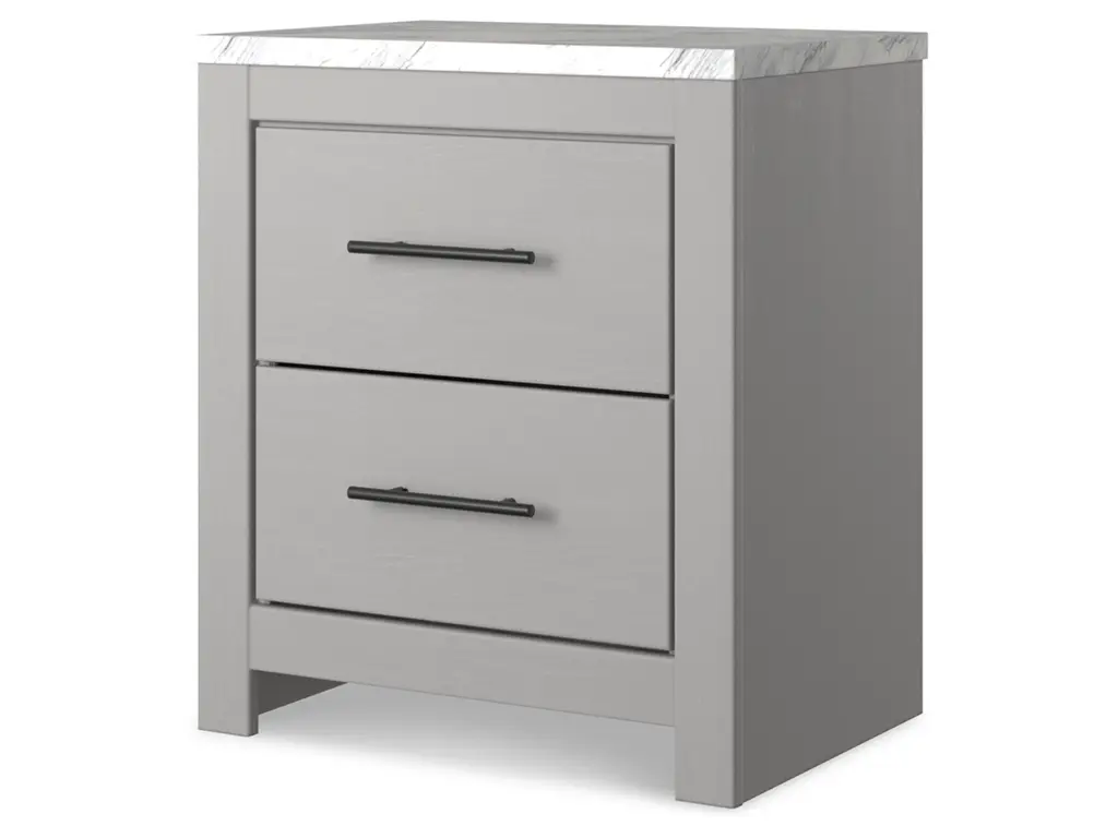 Cool, clean and casually modern. With a wispy dove gray finish and faux marble tops, the Cottonburg bedroom package sets the tone for your calming sanctuary. Its large linear pulls add dimension and authenticity.