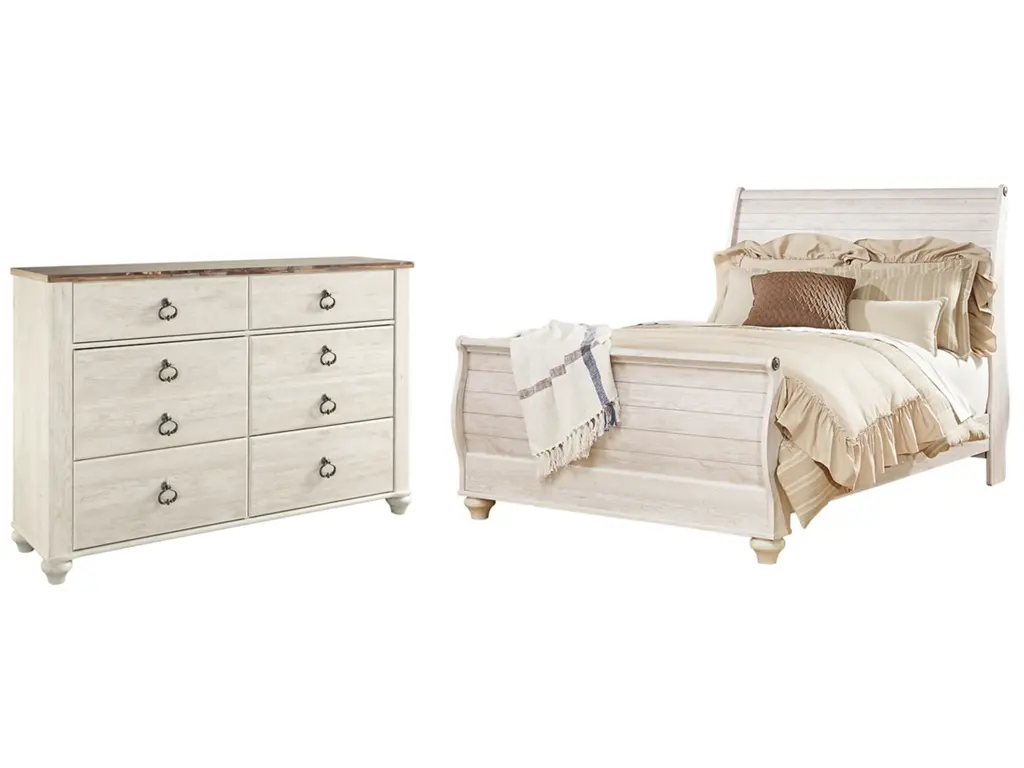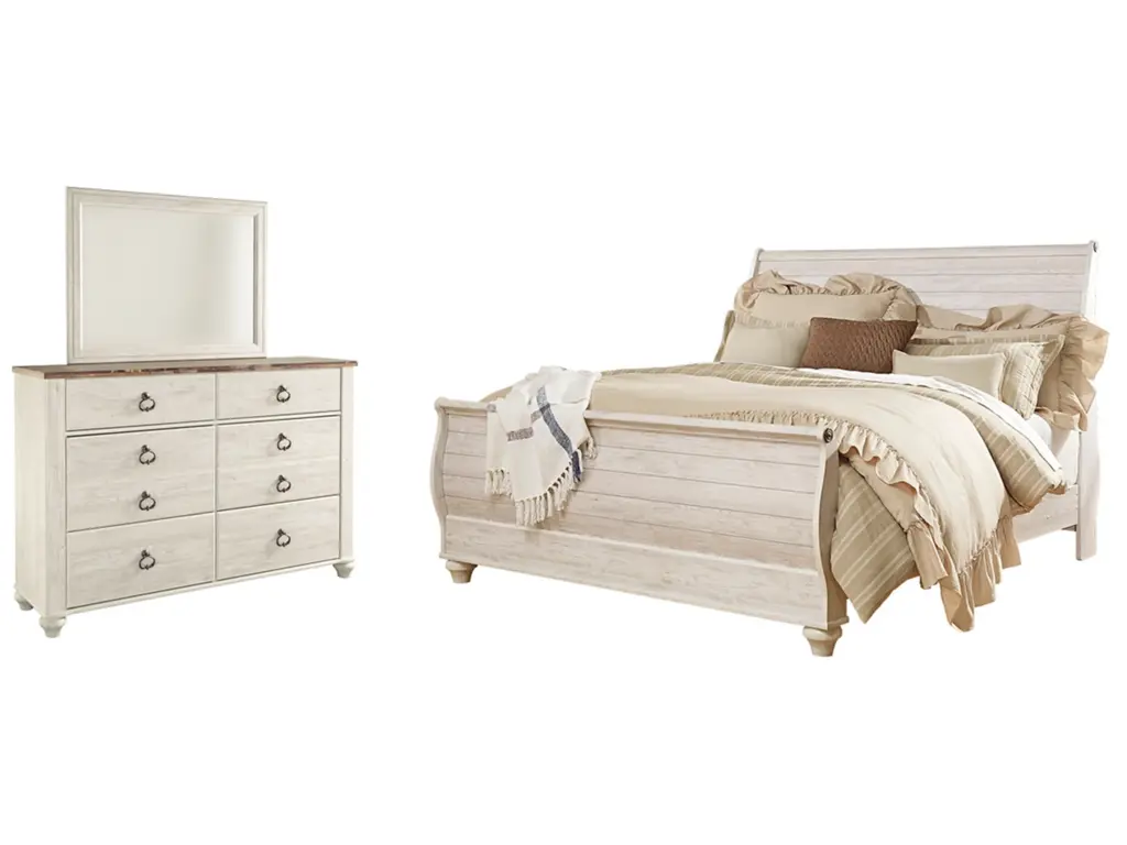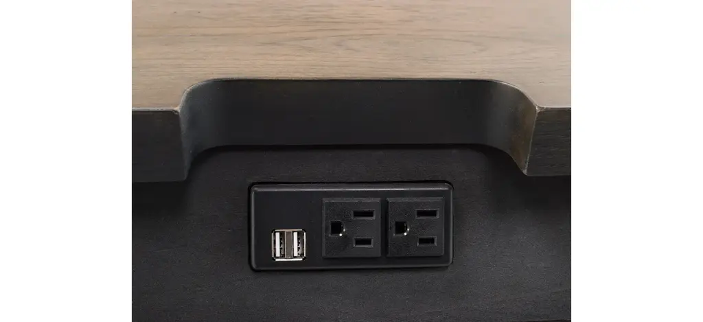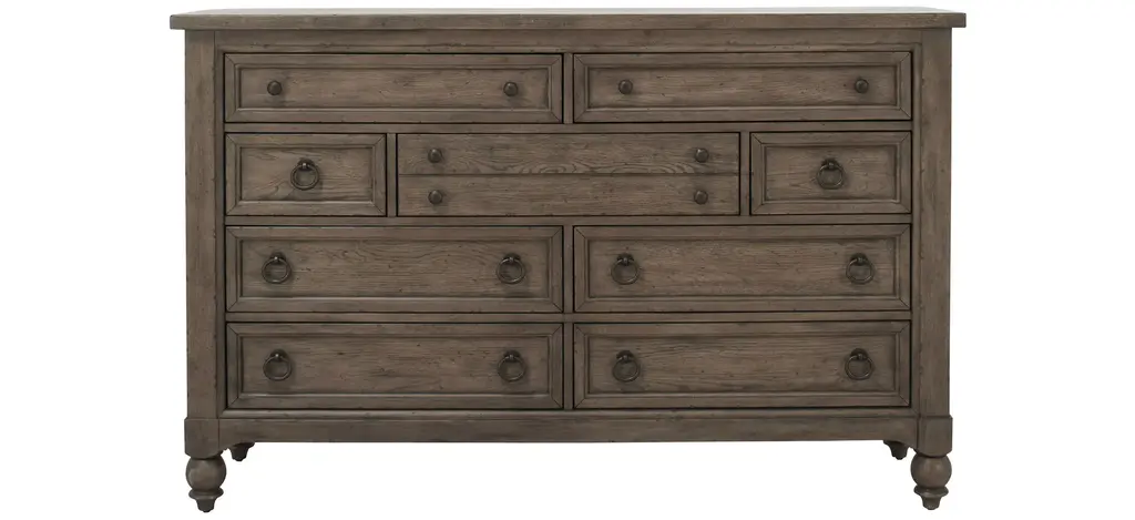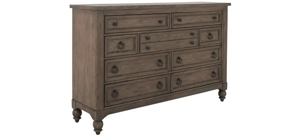 With artistic flair and classic style, the Coventry 4-pc. bedroom set transforms the bedroom into a grand sanctuary of rustic elegance. Crafted of hardwood solids with white oak veneers, this sleep haven features a wire-brushed finish with worm hole distressing. Details like tufted upholstery, nailhead trim, turned bun feet, and antiqued brass hardware define the character, while a charging station in the nightstand and ample storage in the dresser ensure modern functionality.