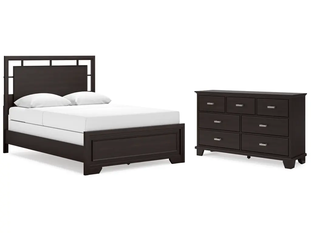 Feast your eyes on the richly versatile Covetown bedroom package. Its traditional-inspired dark brown finish effortlessly blends with contemporary details to create a stunning look that's not too stuffy or too trendy. Such a refined way to wake up your bedroom style.
