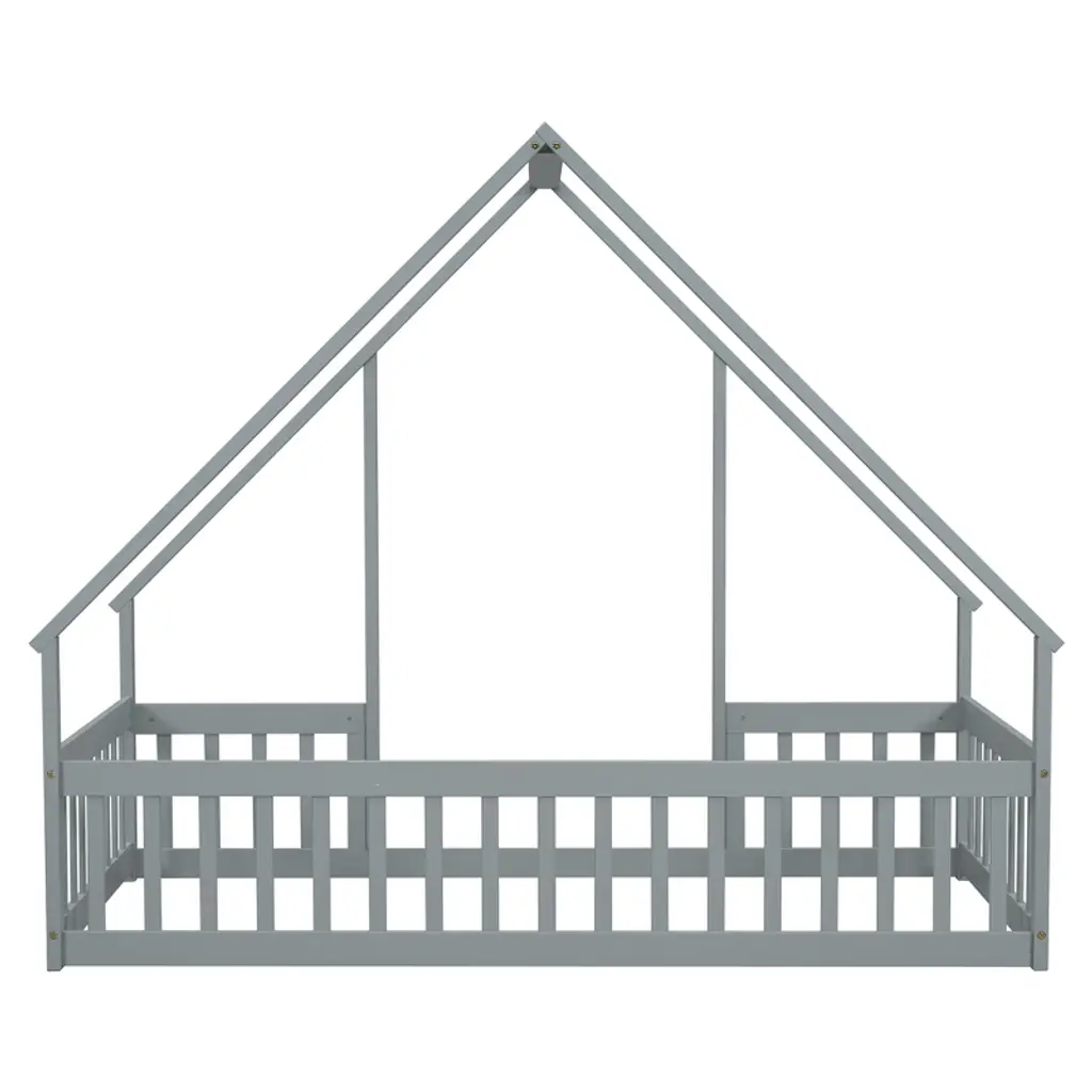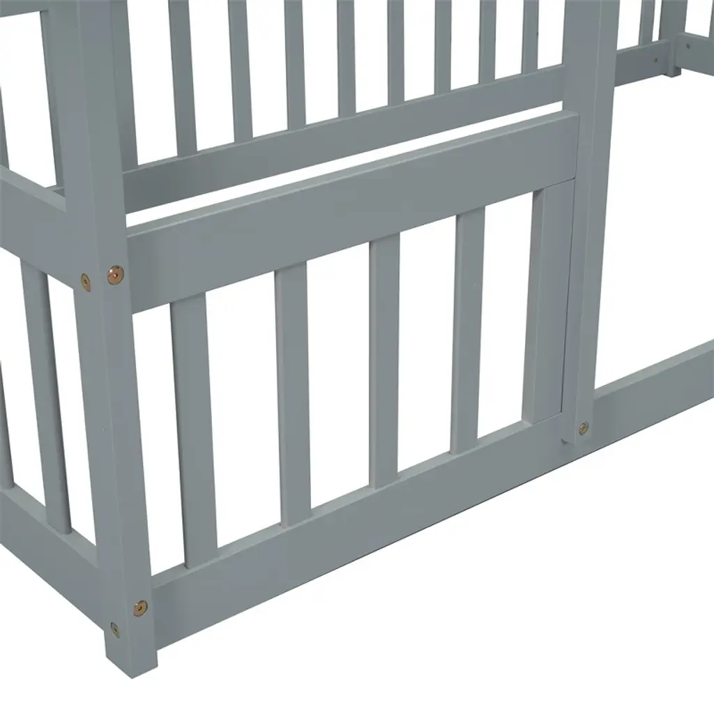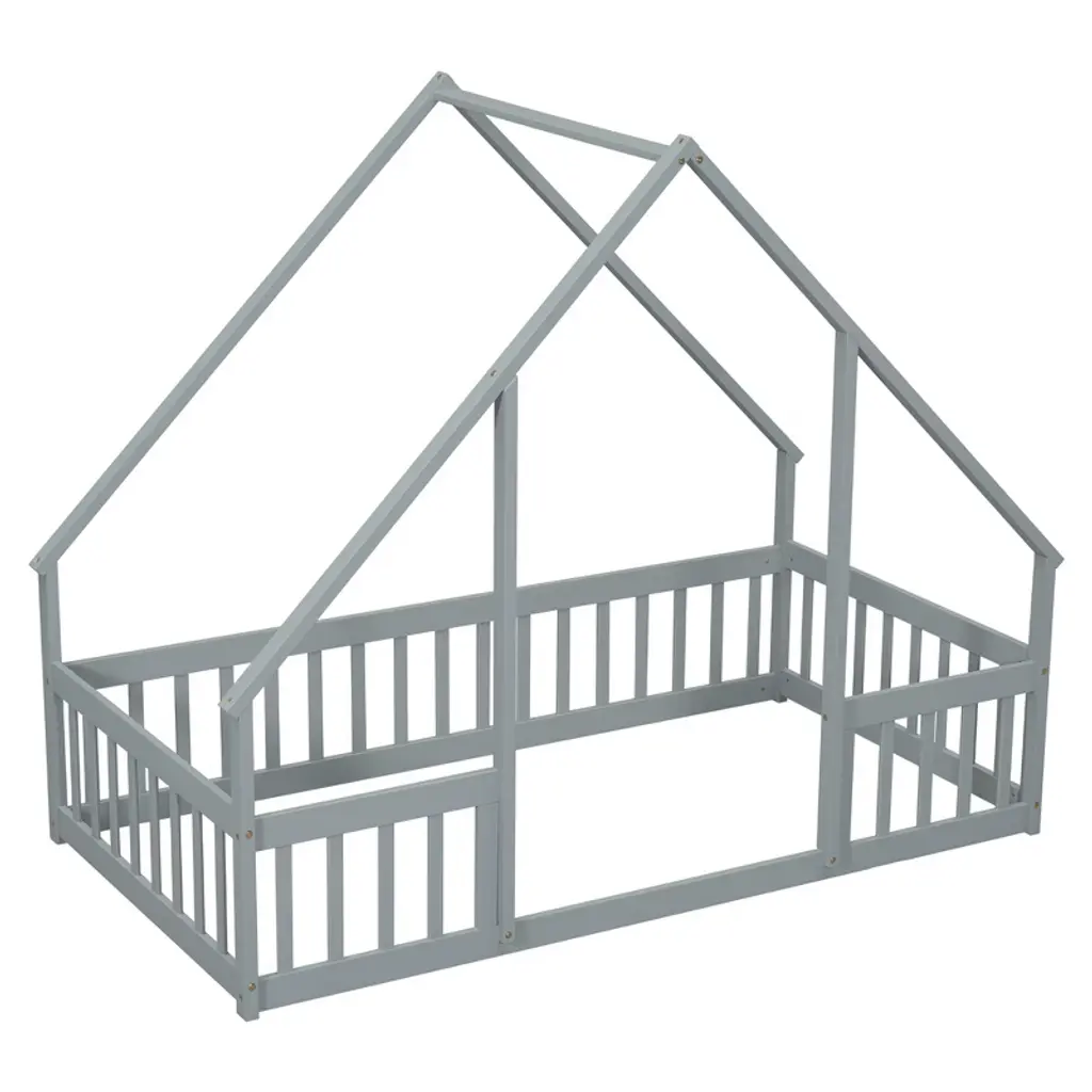 Cowlown Gray Twin Wood House-shaped Floor Bed With Fence Guardrails, Play & Sleep Bed For Kids