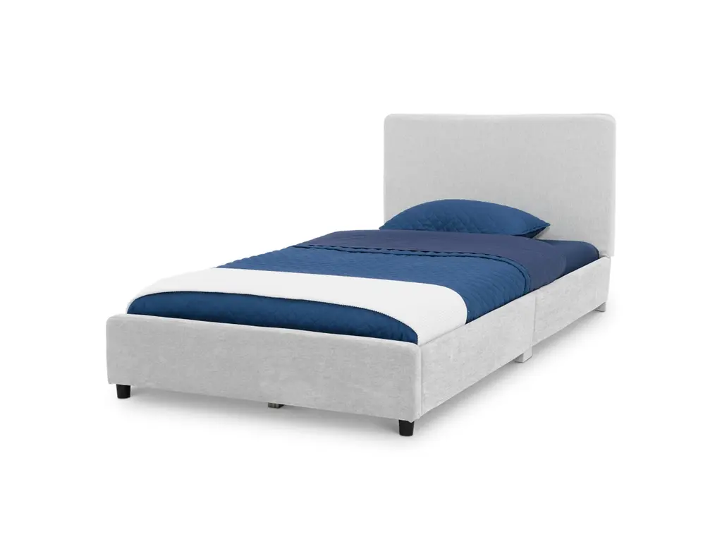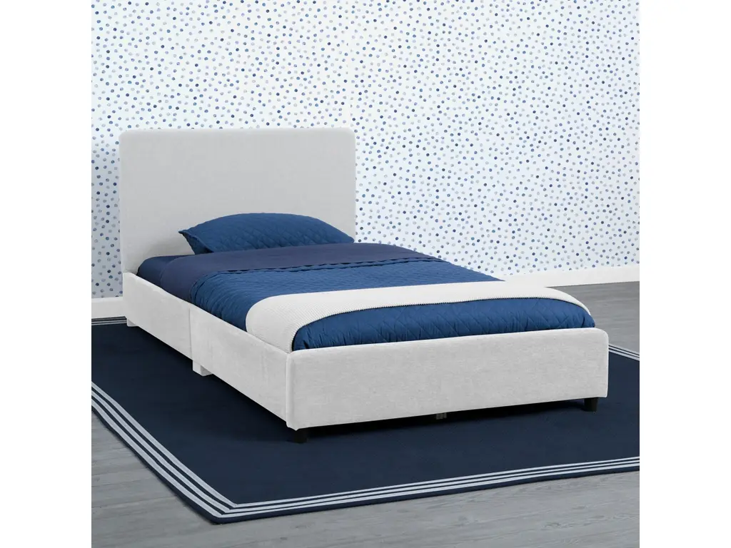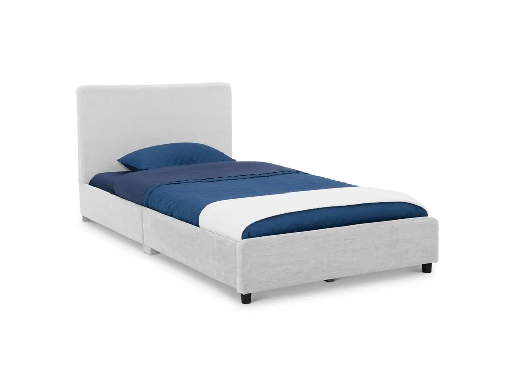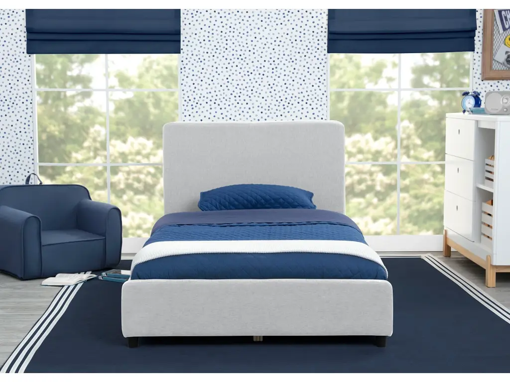 Designed to inspire the sweetest dreams, this Upholstered Twin Bed by Delta Children boasts clean lines and a low profile that's close to the ground, which makes it easier for your little one to get in and out on their own. Accented with plush upholstery and a generously padded headboard for comfort and support while sitting up to read or watch TV, this cozy twin bed is a must-have for your big-kid's bedroom. Plus, it's crafted from quality materials for lasting style and durability. The bed's wood platform frame with slats eliminates the need for a box spring. Twin mattress sold separately.