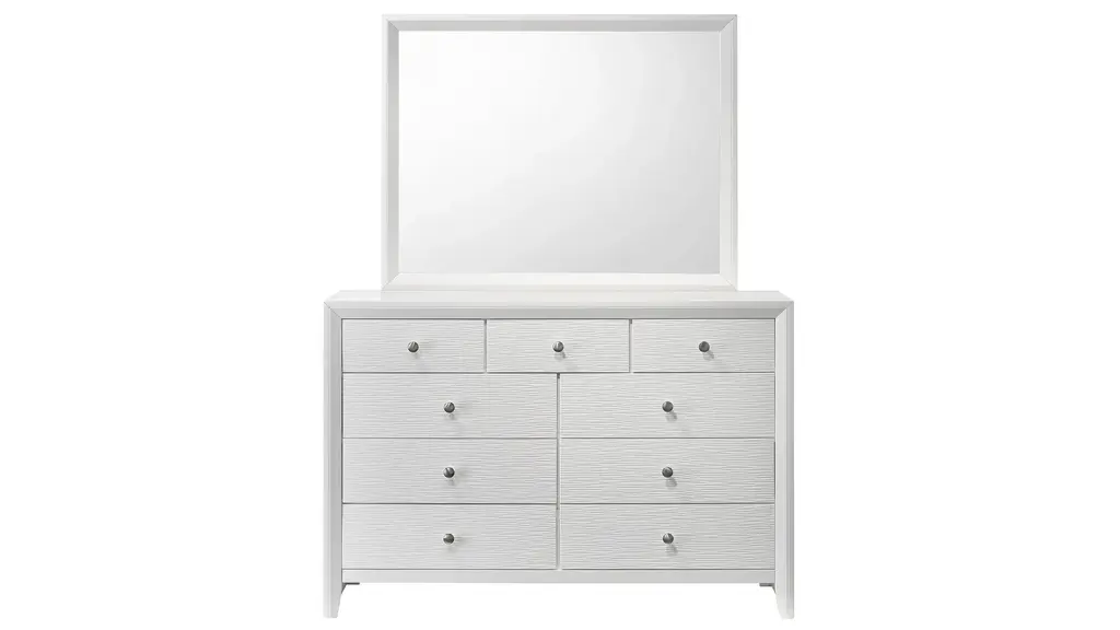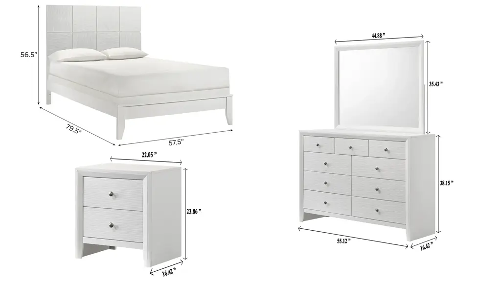 Elevate your sanctuary with this chic and contemporary Denker 4-pc. Bedroom Set that blends functionality with a sleek, modern aesthetic. The collection features a luxuriously bed, that exudes comfort and sophistication. Accompanying the statement bed are matching pieces, including a streamlined dresser, nightstand and chest, each sporting a minimalist design with textured fronts with chrome-accented drawer pulls.