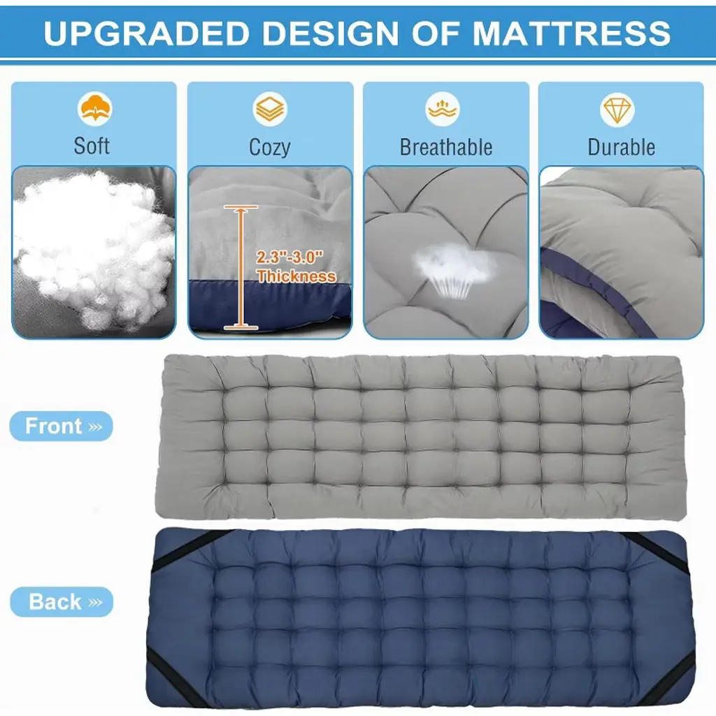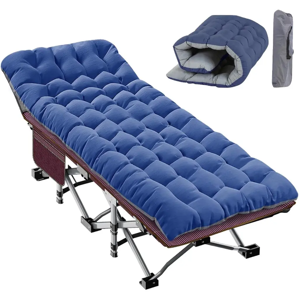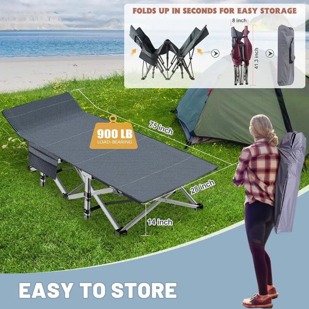 The adult camping bed is made of a square steel frame, supports up to 900 lbs, which is sturdy enough to bear 1 adult sleeping on it to rest. Soft cushions add extra comfort. In hot weather, the cushion can also be taken away for the breathable.This camp bed is constructed in a Double Layer of 1200 D oxford for Superior Strength,Easy- Cleaning. For cleaning, you can wipe the top fabric and the poles with a wet cloth. The crossbar of the cot is lower than the fabric of it. You will sleep well and won’t feel the bar. No need for troublesome installation. our foldable cot opens in less 10 seconds, light weight, easy-to-fold. Unfolded Dimension: 75"X28"X14",Folded Dimension: 41"X 8". This camping cot for adults is perfect for overnight hiking, trekking, hunting, road trip,home relaxing,or office break uses. A great companion to take to the Pool, Lake, RV, Campsite, Patio, Deck, Tent or Cabin. It can be used as a bed for your guest as well. Super convenient.