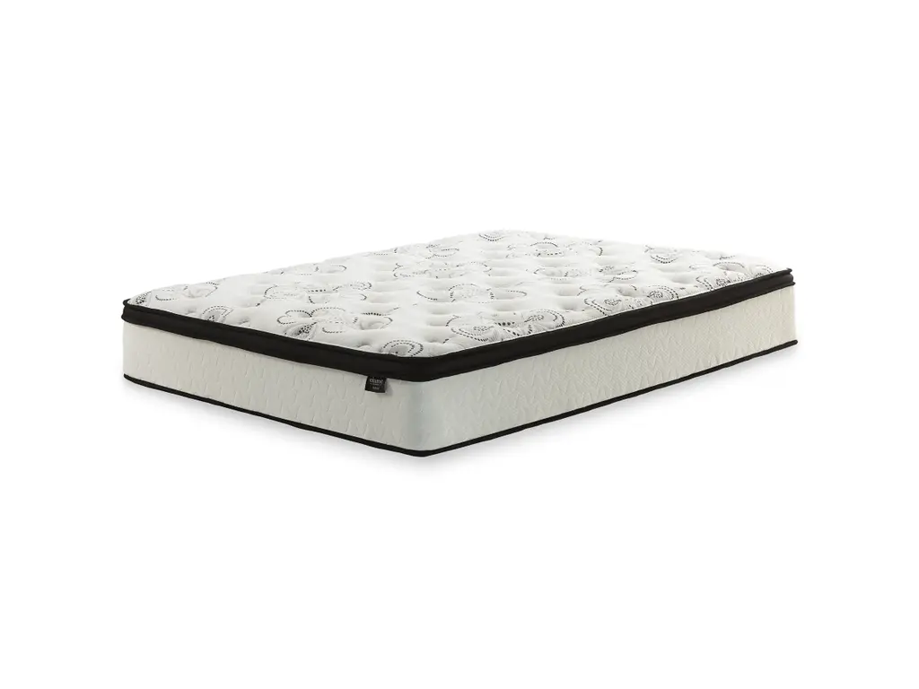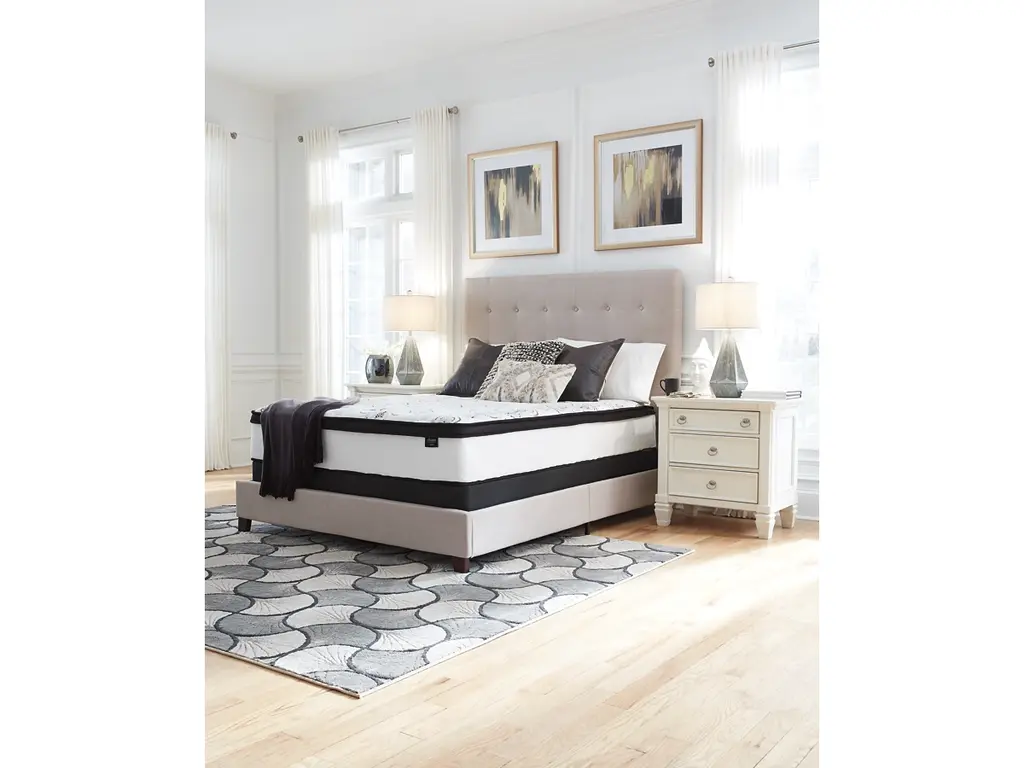 This queen upholstered bed package is sure to awaken a love for modern platform styling with a softer side. Plush to the touch and so easy on the eyes, a pale beige fabric hugs the bed—from the chic headboard with square button tufting, to the low footboard and side rails—emanating the calming mood you long for in the bedroom. The hybrid innerspring mattress gives the support of a truly traditional coil mattress, contouring to your body for a comforting feel. High-density foam provides the firmness you love, while gel memory foam provides restorative support for your lower back.