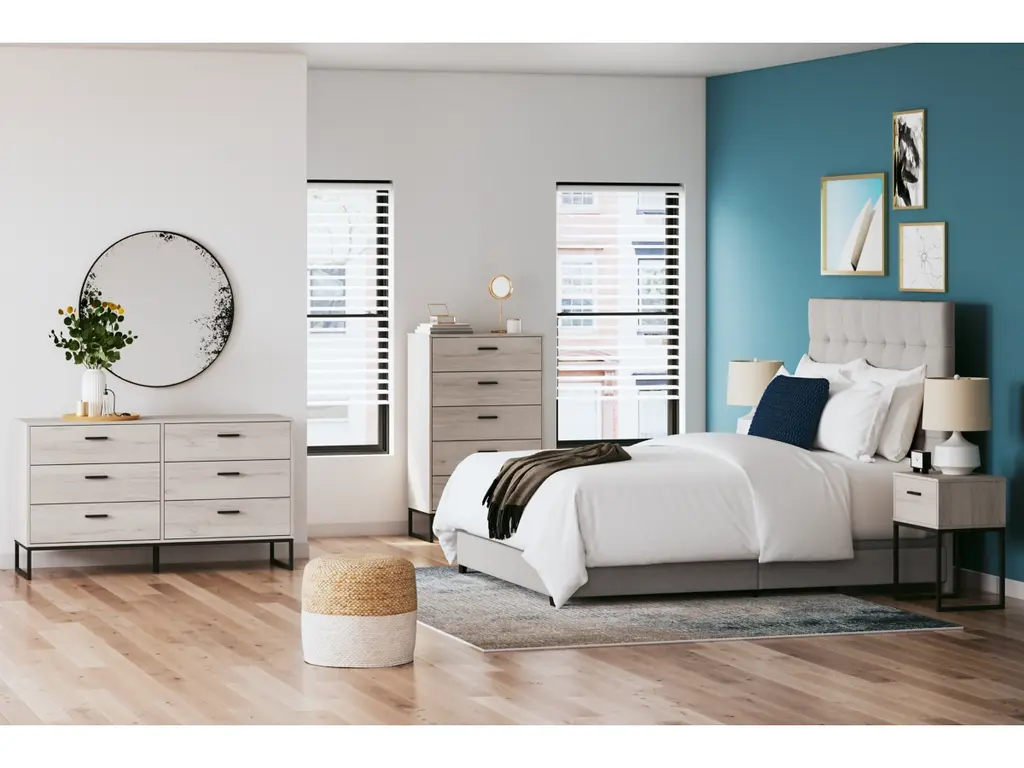 Serenity now. This queen upholstered bed is sure to awaken a love for modern platform styling with a softer side. Plush to the touch and so easy on the eyes, a pale beige fabric hugs the bed—from the chic headboard with square button tufting, to the low footboard and side rails, emanating the calming mood you long for in the bedroom. Mattress and foundation/box spring sold separately.