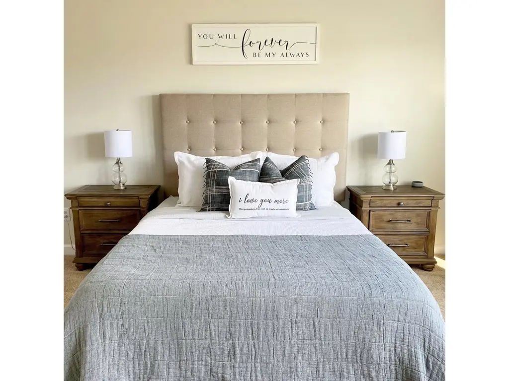 Serenity now. This queen upholstered bed is sure to awaken a love for modern platform styling with a softer side. Plush to the touch and so easy on the eyes, a pale beige fabric hugs the bed—from the chic headboard with square button tufting, to the low footboard and side rails, emanating the calming mood you long for in the bedroom. Mattress and foundation/box spring sold separately.