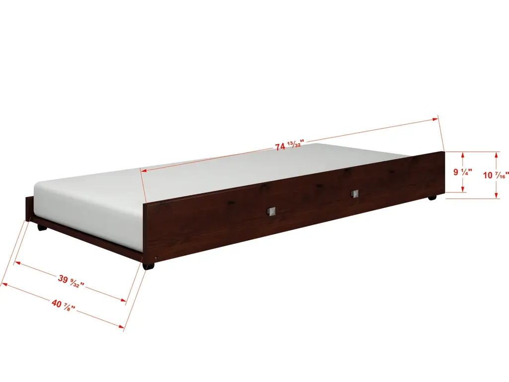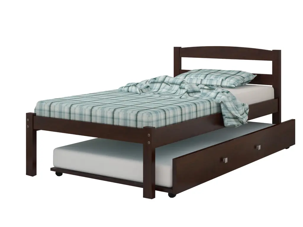 Transform bedtime into a charming adventure with our Econo Scandinavian Twin Cappuccino Bed with Twin Trundle from Donco Kids. Crafted with love and expertise, this bed encapsulates the essence of family comfort and style. Sturdy pine wood, finished in a safe non-toxic cappuccino paint, ensures lasting quality. Whether it is for your little one's peaceful slumber or a sleepover delight, the included trundle bed rolls effortlessly underneath when not in use. Meeting or Exceeding federal safety standards, so you can relax while your little ones drift off to dreamland.