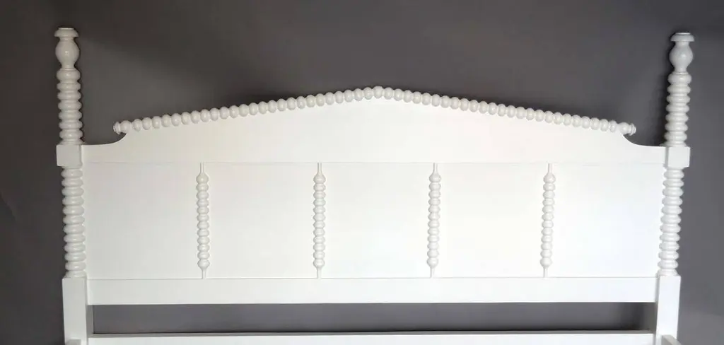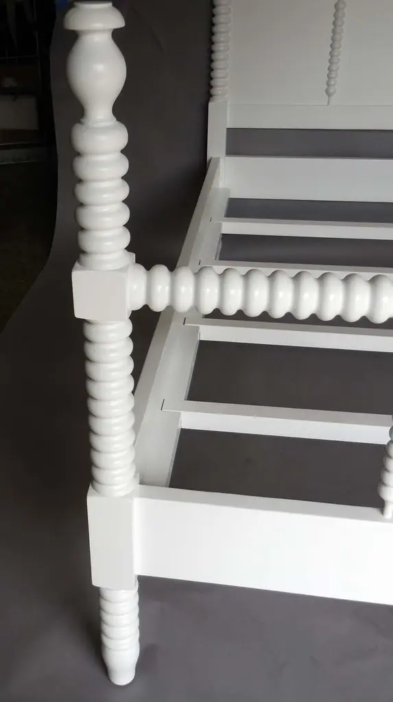 Custom king-size bobbin bed with solid headboard and a painted finish. Can be finished in a variety of colors and in different sizes. Made by Dos Gallos Studio in Los Angeles.CUSTOM PRICES ARE SUBJECT TO CHANGE. PLEASE INQUIRE BEFORE PLACING AN ORDER. CUSTOM ORDERS ARE NON RETURNABLE. FINAL SALE