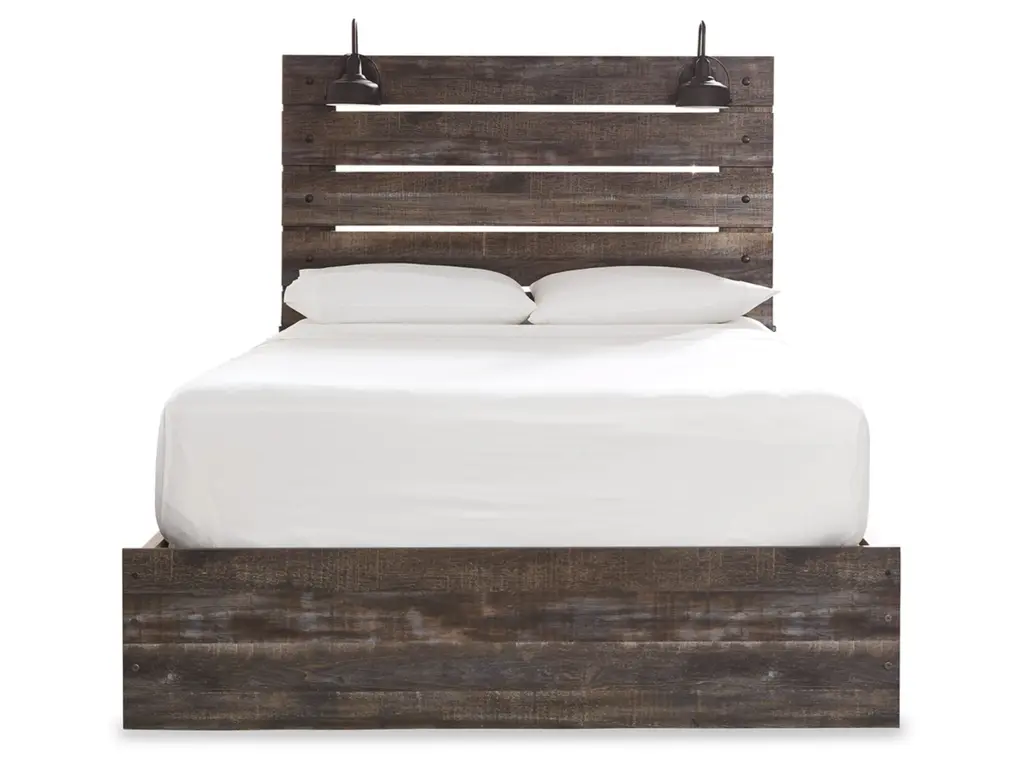 When merged in just the right way, rustic and industrial styles can make one happy marriage. Case in point: the Drystan queen panel bed with storage. A refined take on barn board beauty, its complex, replicated wood grain showcases hints of burnt orange and teal tones for a sense of weatherworn authenticity. Love to read in bed? You’re sure to find the pair of retro-chic light sconces and USB plug-ins on the open-slat style headboard such a bright idea. Underneath the bed: smooth-gliding drawers and open cubbies that accommodate casually cool storage bins.