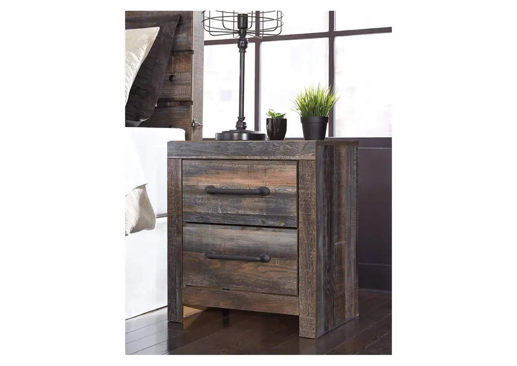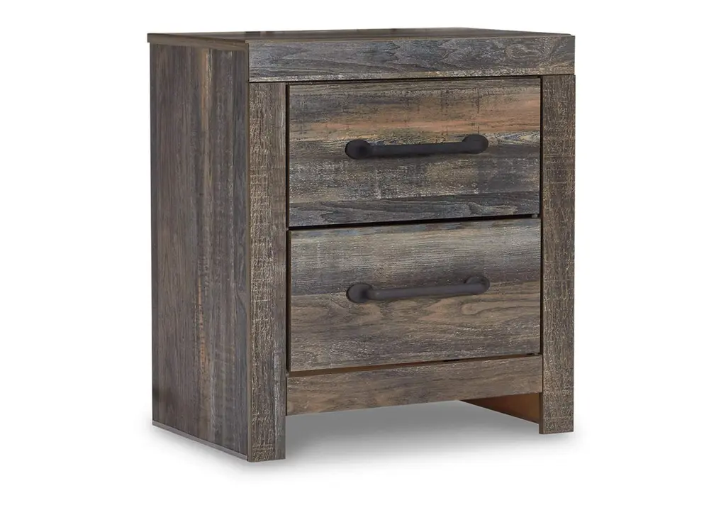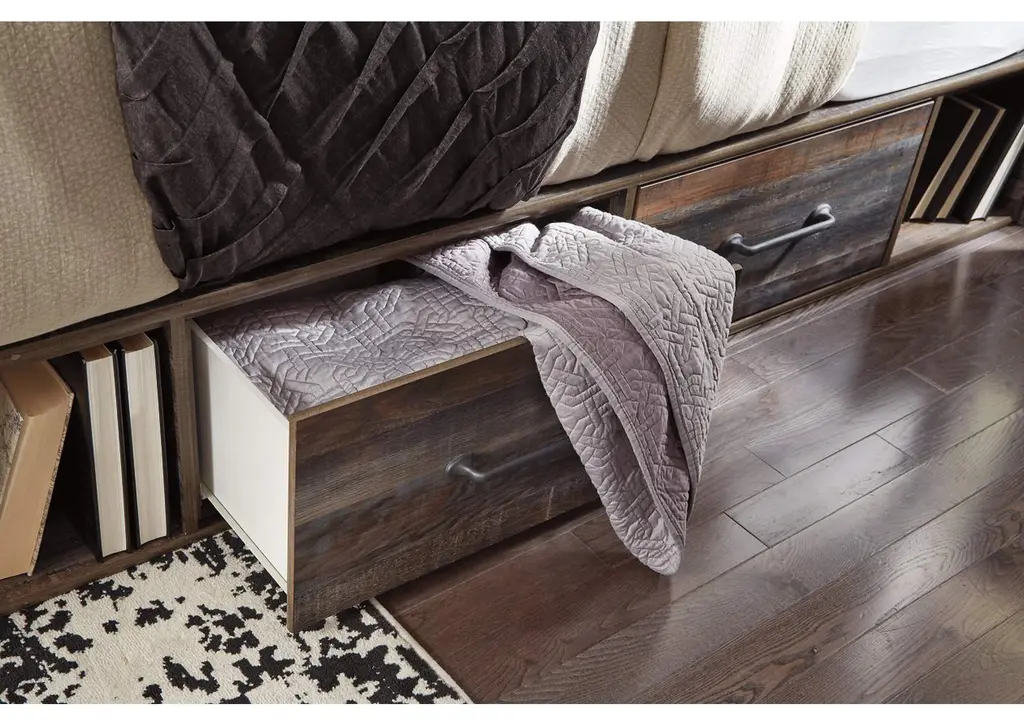 When merged in just the right way, rustic and industrial styles can make one happy marriage. Case in point: the Drystan bedroom set with storage bed, dresser/mirror, chest and nightstand. A refined take on barn board beauty, its complex, replicated wood grain showcases hints of burnt orange and teal tones for a sense of weatherworn authenticity. Love to read in bed? You’re sure to find the retro-chic light sconces and USB plug-ins on the open-slat style headboard such a bright idea. Underneath the bed: smooth-gliding drawers and open cubbies that accommodate casually cool storage bins. Elongated metal drawer pulls elevate the aesthetic.