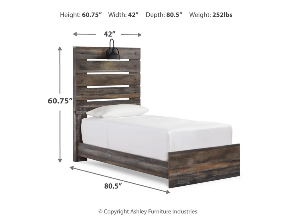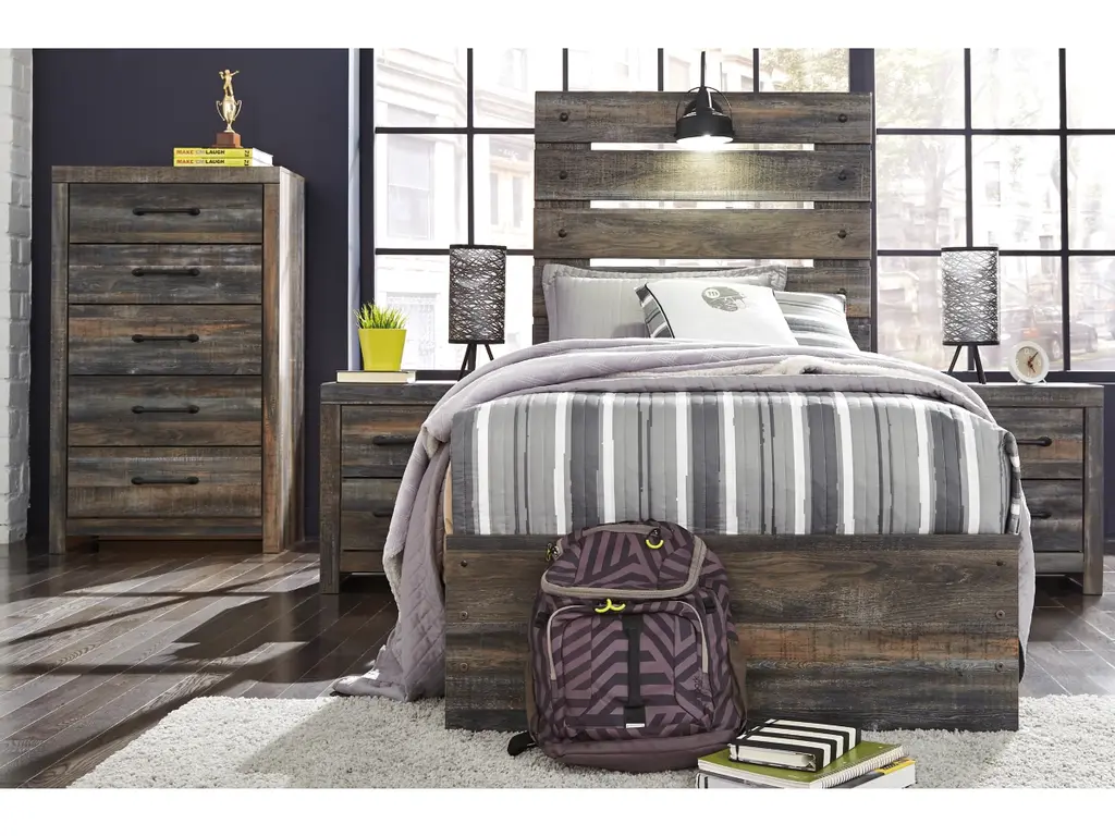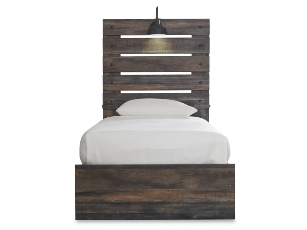 When merged in just the right way, rustic and industrial styles can make one happy marriage. Case in point: the Drystan twin panel bed with storage. A refined take on barn board beauty, its complex, replicated wood grain showcases hints of burnt orange and teal tones for a sense of weatherworn authenticity. Those who love to read in bed are sure to find the retro-chic light sconce and USB plug-ins on the open-slat style headboard such a bright idea. Underneath the bed: four smooth-gliding drawers and four open cubbies that accommodate casually cool storage bins.