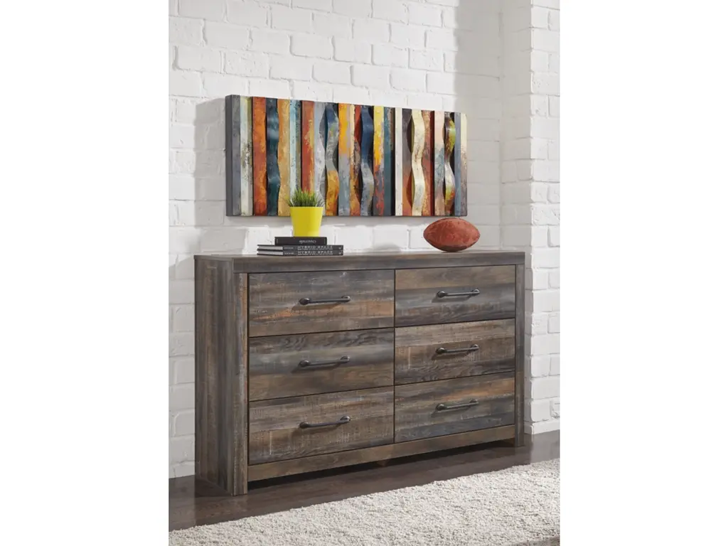 When merged in just the right way, rustic and industrial styles can make one happy marriage. Case in point: this bedroom package. A refined take on barn board beauty, its complex, replicated wood grain showcases hints of burnt orange and teal tones for a sense of weatherworn authenticity. Elongated metal drawer pulls elevate the aesthetic.
