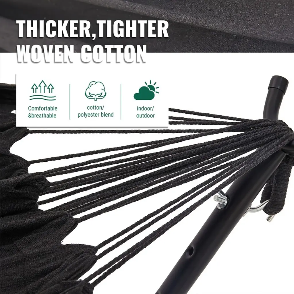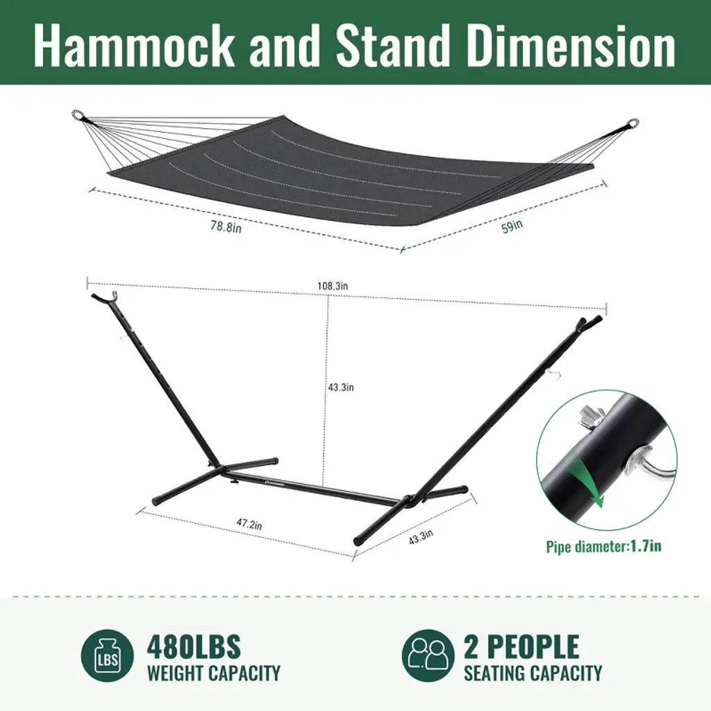 Enjoy worry-free relaxation: This heavy-duty hammock supports up to 480 lbs with a rust-resistant steel frame and 6 adjustable hooks for personalized comfort, perfect for two adults. Set up in minutes without tools—PVC anti-slip feet ensure stability indoors or outdoors, while the 320g polycotton fabric offers durable comfort for reading, naps, or sunny day escapes. Year-round versatility: Designed for gardens, camping, or balconies, its weather-resistant construction and spacious design (78.75”x60”) make every season a cozy retreat.