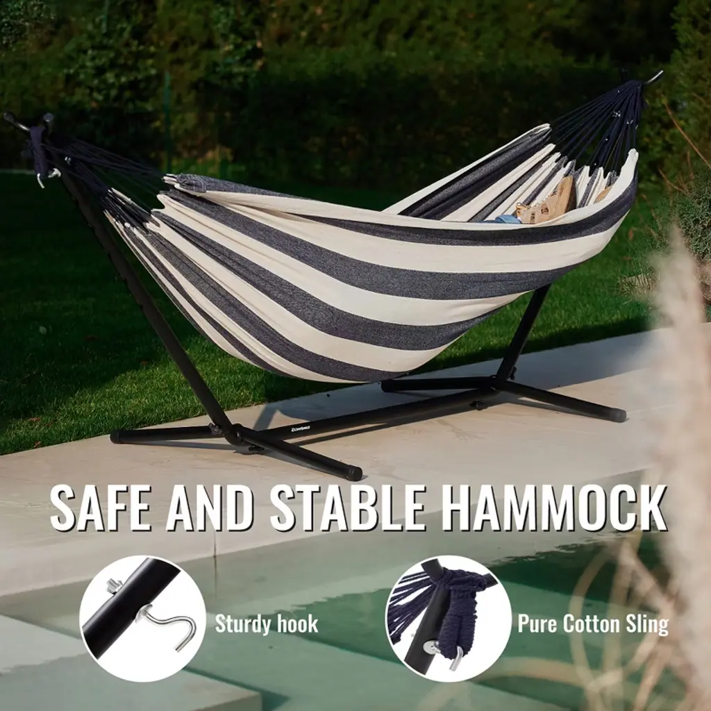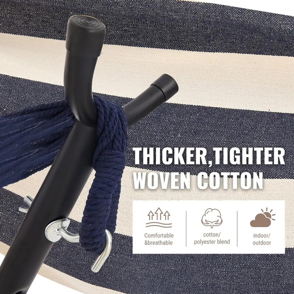 Enjoy worry-free relaxation: This heavy-duty hammock supports up to 480 lbs with a rust-resistant steel frame and 6 adjustable hooks for personalized comfort, perfect for two adults. Set up in minutes without tools—PVC anti-slip feet ensure stability indoors or outdoors, while the 320g polycotton fabric offers durable comfort for reading, naps, or sunny day escapes. Year-round versatility: Designed for gardens, camping, or balconies, its weather-resistant construction and spacious design (78.75”x60”) make every season a cozy retreat.