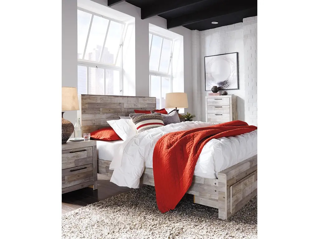 Butcher block has long been a staple in the kitchen, but the Effie queen panel bed with storage transforms it into something fresh and new in the bedroom. A vintage whitewashed finish over replicated wood grain lends an urban farmhouse aesthetic to your restful retreat. Mattress available, sold separately.