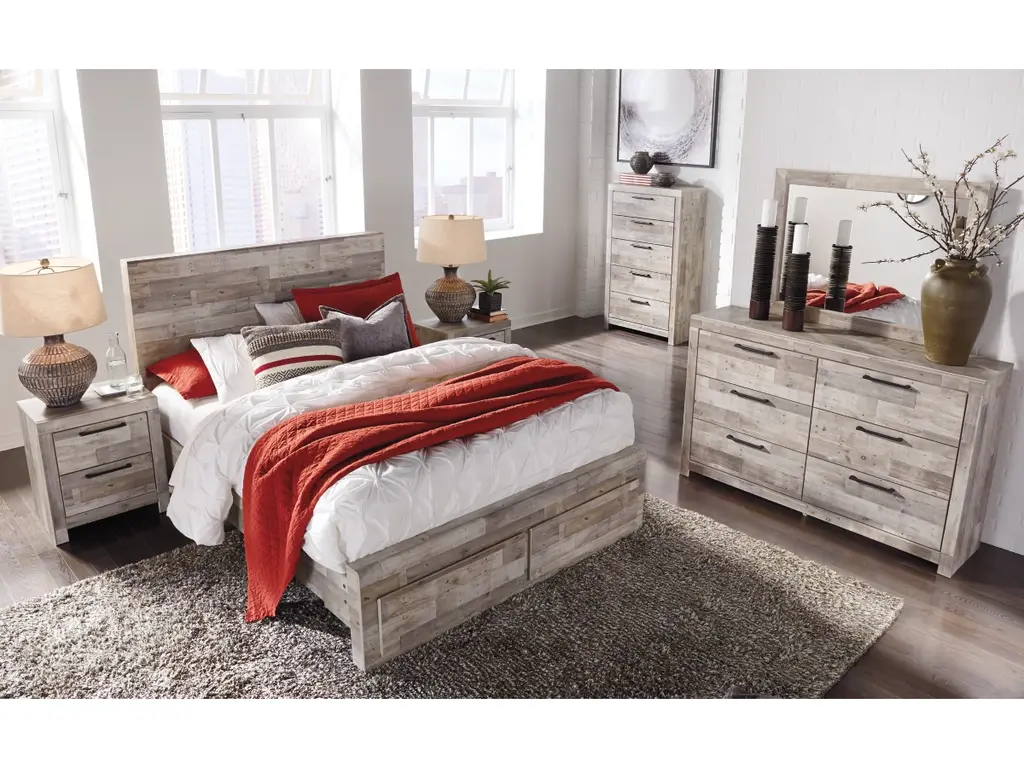Butcher block has long been a staple in the kitchen, but the Effie panel bed with storage transforms it into something fresh and new in the bedroom. A vintage whitewashed finish over replicated wood grain lends an urban farmhouse aesthetic to your restful retreat. Mattress available, sold separately.