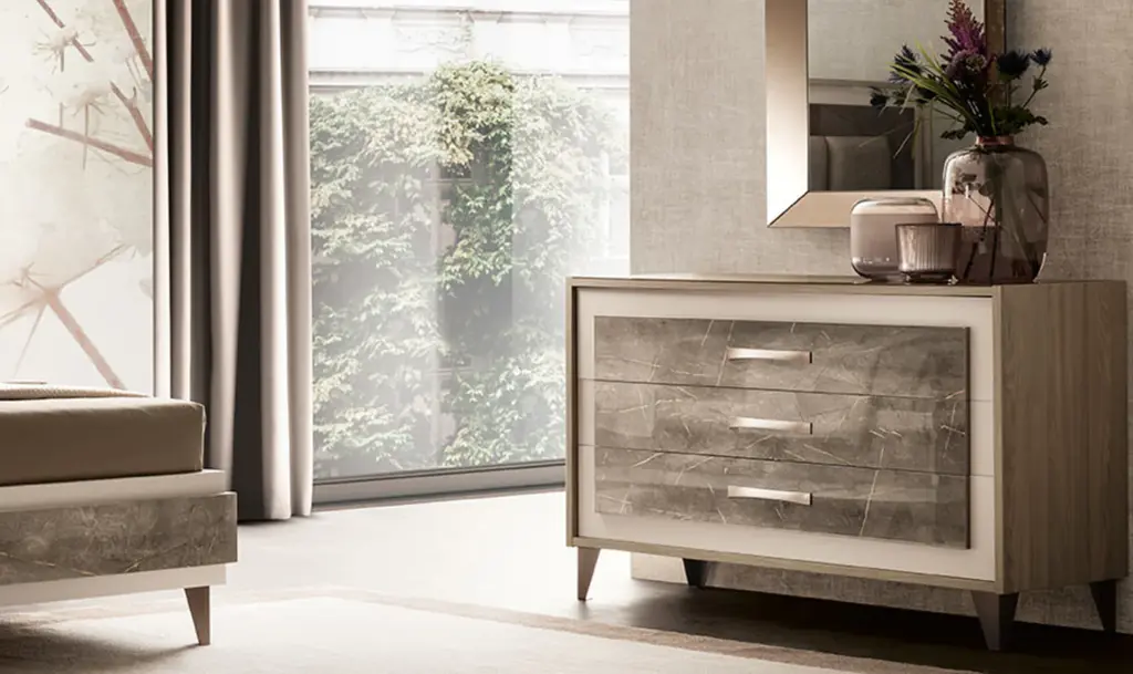 The ArredoAmbra Bedroom by ESF Furniture was designed to guarantee functionality and comfort. Yes to relaxation and practicality: these are the needs met by this piece of furniture with its remarkable comfort level. A LED Light control enriches the bed's headboard featured and large marble-finish top which is then found again along the foot-board and the bed stringer, in perfect harmony with the colors of the satin-finished bronze feet.ArredoAmbra is a furniture collection for living areas and bedrooms. Once again, ArredoAmbra has left its unmistakable hallmark on furniture items that fly the flag for the prestige of Italian style and the Italian flair for furniture with elegance and an inimitable contemporary flavor.About the CollectionArredoAmbrais a furniture collection that encompasses the entire home and it has been designed for those who love a modern style combined with elegance, straightforwardness, and a refined spirit, where every detail makes the difference.