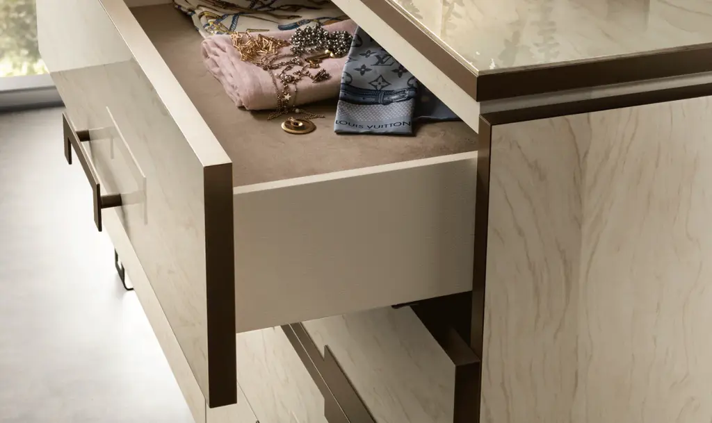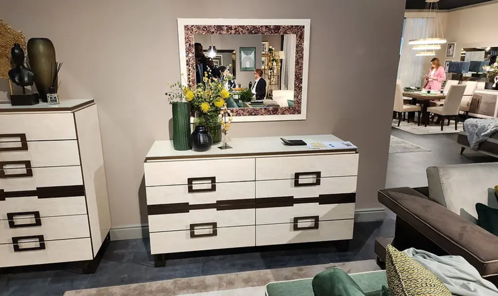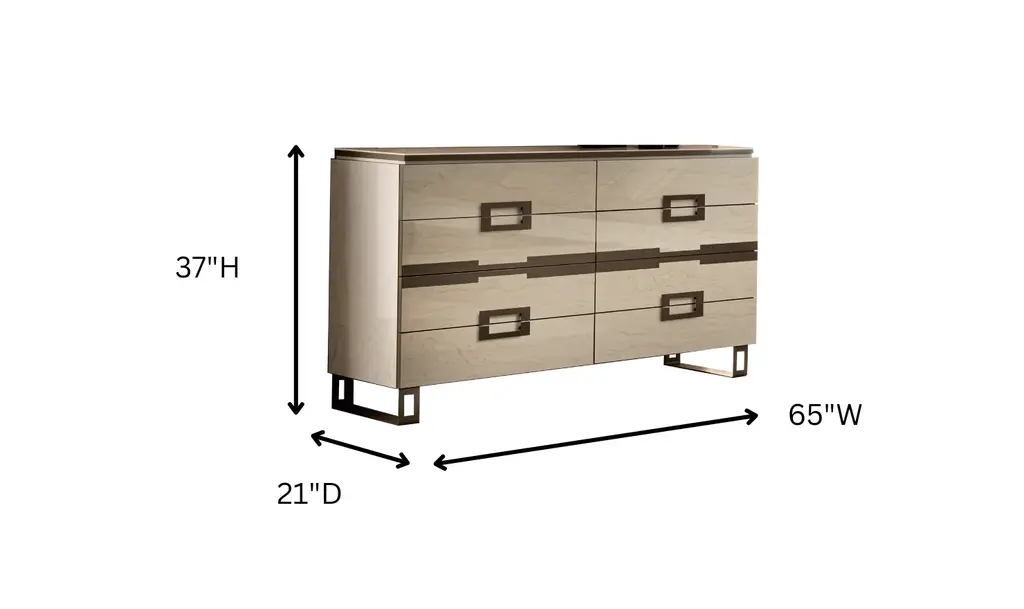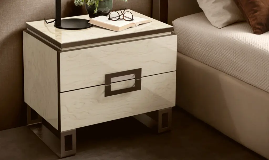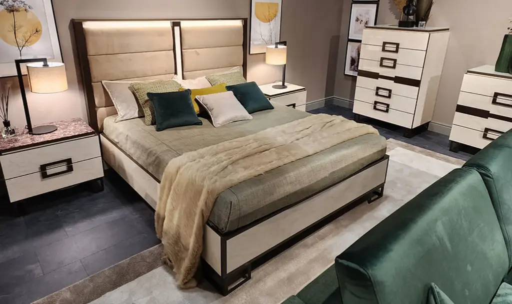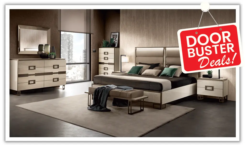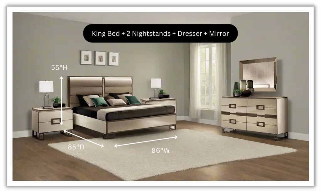 Introducing the Poesia 5-piece Wooden Bedroom Set with LED Light, a symbol of intimacy and ultimate comfort. Available in various configurations, this collection offers options such as wooden or upholstered headboards with integrated LED lighting for added ambiance. With a storage box option, it combines functionality with elegance. Crafted with meticulous attention to detail, each piece exudes the beauty and sophistication of Italian design. Incorporating minimalist details and sophisticated materials, the Poesia bedroom set is a fusion of refined character and contemporary style. Its beige and brown color palette adds warmth and versatility to any bedroom decor, while the wood veneer and MDF construction ensure durability and longevity. The upholstered headboard and LED light provide both comfort and modern flair, elevating your bedroom experience to new heights. With its classic style and easy-to-clean design, the Poesia bedroom set is perfect for those seeking a timeless yet functional addition to their home. Whether you prefer a traditional or contemporary aesthetic, this collection seamlessly blends sophistication and practicality, creating a space that exudes elegance and charm. Experience the epitome of Made-in-Italy beauty with the Poesia bedroom set from Adora.Note:5 Pieces Includes: Bed + Dresser + Mirror + 2 Nighstands6 Pieces Includes: Bed + Dresser + Mirror + 2 Nighstand + Chest