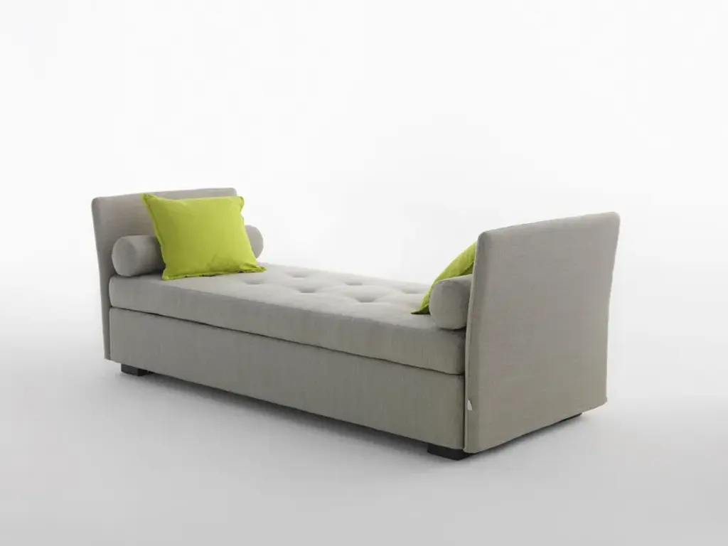 Figi Isoleuse Extractable is a removable fabric Dormeuse with removable net.Figi Isoleuse with pull-out trundle is part of the “Figi Isole” program: a collection of single beds / sofa beds. Seven models, three sizes and three different cushion seats make Figi Isole a versatile product that can be adapted to any environment or use: from a large living room to a small service room, from the children's room to a hotel room. All Figi beds can be fitted with a storage compartment or a pull-out trundel and are available in three different mattress sizes. Until 2018 the product was marketed under the brand Orizzonti Italia.The Figi Islands are available in three Models:› [1] fixed› [2] storage› [3] pull-outStandard configuration The product includes the following elements:› for [1-2-3]: structure› for [1-2-3]: slatted base› for [1-2-3]: removable cover in fabric, leather or faux leather› for [2]: liftable base with storage› for [3]: pull-out wooden baseElements of completion› [4] cushion seat without buttons - removable cover› [5] cushion seat with buttons - non removable cover› [6] mattress, model Sit & Sleep› any other mattressSit & Sleep mattresses› Standard ecological foam mattress with simple cotton blend lining.› Memorymattress consists of an ecological foam plate coupled with a sheet of viscoelastic memory foam. Quilted cover in mixed cotton, padded with hypoallergenic fibre.Optional accessories› [7] lightly-padded bedspread suitable for a mattress H16 cm› [8] padded cushion for backrest› [9] cushions, pillows and bolsters